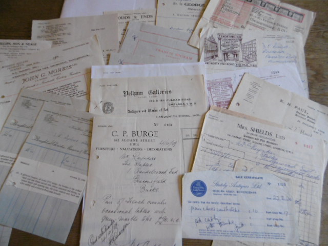 The materials also include an amazing selection of invoices (dating from the 1940s-1970s) from a wide variety of Antique Dealers; these are invaluable to the research project – they give us, for example, key self-designated descriptions of the dealers themselves, dealer addresses, as well as often having detailed information on the people involved in the various businesses, not to mention the fascinating ways in which a variety of ‘antiques’ are described in the old invoices.
