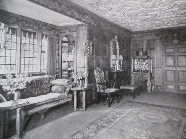 Thornton-Smith bought the site of the original manor house at Shoppenhangers (the site had already been cleared of the remains of the original manor) in 1914 and set about recreating a 16th century manor house on the foundations of the original house. The project seems to have taken 4 years to complete, and was assembled, recreated, using an astonishing range of architectural elements, from a wide geographical area, and made available through a variety of opportunities and events. Painted glass from Selby Abbey, for example, made available following the major fire at Selby Abbey in 1906, was installed in the ‘Long Room’ at Shoppenhangers; there were ceilings from an ‘ancient inn at Banbury’, and panelling from an ‘old house’ at Faversham, as well as that ‘removed from a Venetian Palace’. Other materials apparently came from West Wycombe Park and from ‘an ancient house in Spain’. One of the most important rooms in Shoppenhangers Manor, the ‘drawing room’ was lined with panelling from Billingbear Park, Wokingham.