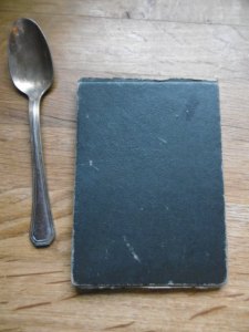 Phillips of Hitchin archive, notebook, c.1920; with teaspoon for scale. Photograph, Antique Dealer Project, University of Leeds 2017.