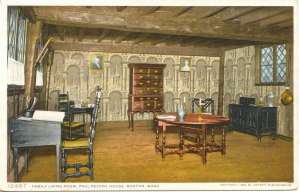 The annotation reads – ‘Colonial Wallpaper from Paul Revere’s house, Boston. Inset – old London churches by Wren. Repeat about 3ft high.’ The note is perhaps suggesting that the design would be a good model for the reproduction of a wallpaper (or a fabric?), which was something that the firm of Phillips of Hitchin were well-known for in the period; they were, in effect, Interior Decorators, as well as antique dealers, as were many other antique dealer firms in the period (see earlier blog posts on Thornton for example). The annotation also demonstrates the keen and attentive eye of Amyas; the drawing is, as one might expect, an accurate illustration of the view encountered by the compiler of the notebook at Paul Revere’s House – here’s a colour postcard from c.1909 of the interior of the house captured in the drawing in the notebook.