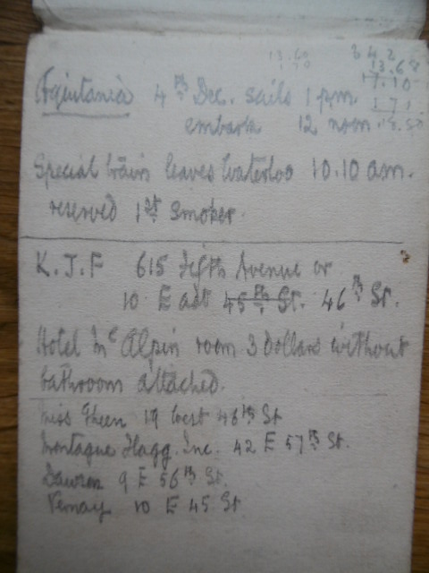 The notebook begins with a note suggesting that Amyas was to begin his travels to New York on the ‘Aquitania’, on ‘4th Dec.’ – ‘sails 1pm, Embark 12 noon’; with another note mentioning that a ‘special train leaves Waterloo 10.10am’ – it seems that Amyas had also reserved a First Class, Smoking, train cabin.