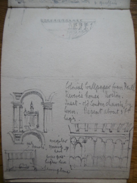 The annotation reads – ‘Colonial Wallpaper from Paul Revere’s house, Boston. Inset – old London churches by Wren. Repeat about 3ft high.’ The note is perhaps suggesting that the design would be a good model for the reproduction of a wallpaper (or a fabric?), which was something that the firm of Phillips of Hitchin were well-known for in the period; they were, in effect, Interior Decorators, as well as antique dealers, as were many other antique dealer firms in the period (see earlier blog posts on Thornton for example). The annotation also demonstrates the keen and attentive eye of Amyas; the drawing is, as one might expect, an accurate illustration of the view encountered by the compiler of the notebook at Paul Revere’s House – here’s a colour postcard from c.1909 of the interior of the house captured in the drawing in the notebook.
