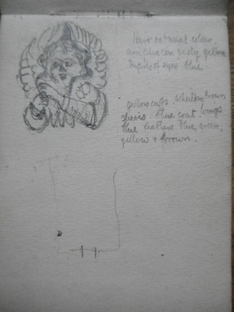 Page of a drawing of a carved figure?, with annotations on colours. PoH archive notebook, c.1920 uncatalogued. Brotherton Library Special Collections, University of Leeds, 2017.