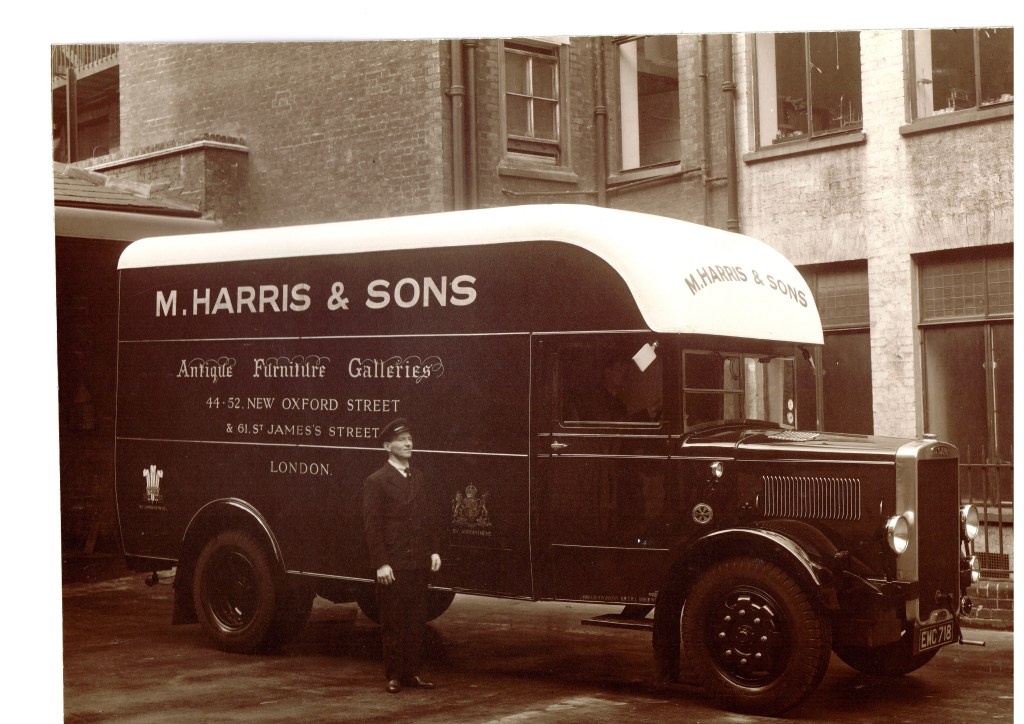 John also sent us a photograph of the Moss Harris & Sons’ delivery van, also dating from c.1935; another very smart thing and indicative of the high class antique dealer business that Moss Harris had become by the 1930s.