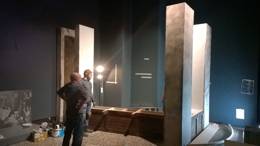 Once the 1850 shop was in the exhibition space, Viv and Ant quickly set about assembling it – I think it will look spectacular…but as I had to leave The Bowes Museum at 5pm today I only got to see the uncompleted structure…but even so, it was certainly beginning to look amazing – below is the effect once the lower front wall of the shop had been completed.
