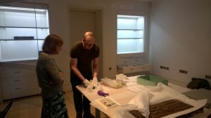 The install is going well, and Katie Herington (my co-curator on this exhibition) together with Fred, our amazingly helpful gallery technician, and Jill and Laura, have been busy unpacking and placing the objects in the space.