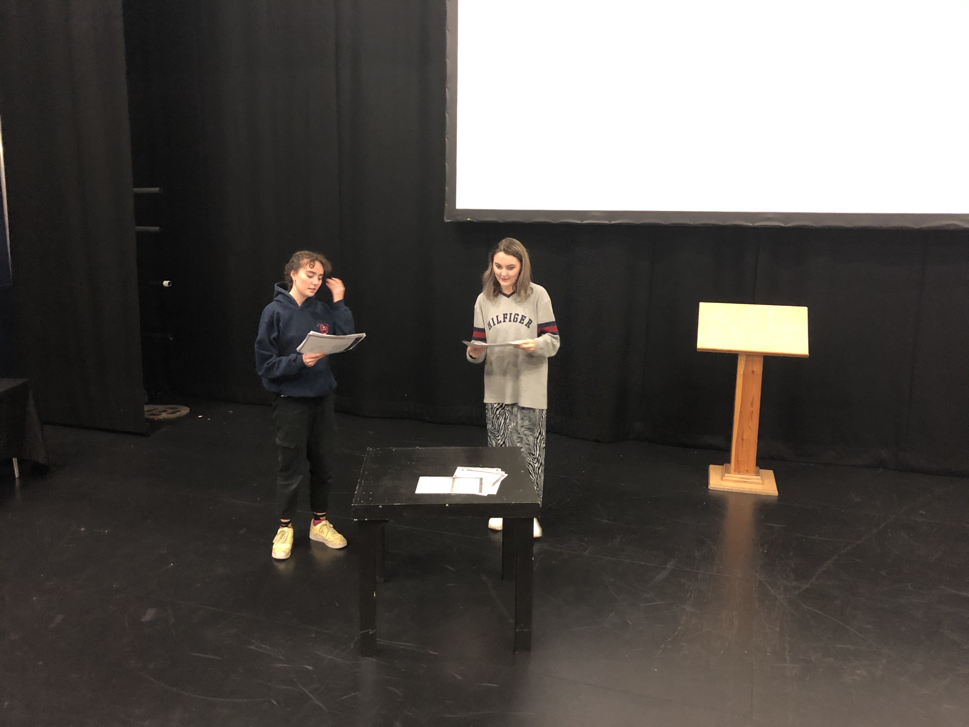 Hannah, another of the student actors, also joined in the rehearsals, playing the part of Susan Quinney, Quinney’s wife – here’s Annabel (left) as ‘Posy’, with Hannah (right) as ‘Susan’, reading from a scene in Act 1.