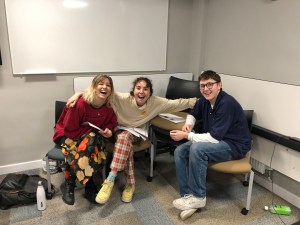 Our progress on re-staging our performance of Quinneys is coming along well; yesterday (a Saturday no less!) India Walton and I went to the Leeds Playhouse Costume Hire stores to choose the costumes for all the characters in the play – India is playing the part of ‘Mable Dredge’, Quinney’s typist, who in the play is in the triangle of love between James (Quinney’s foreman – played by Fergus Johnston) and Posy (Quinney’s daugther – played by Annabel Marlow) – here, (below) is India (left), with Annabel (centre) and Fergus (right) in rehearsals earlier in the week.