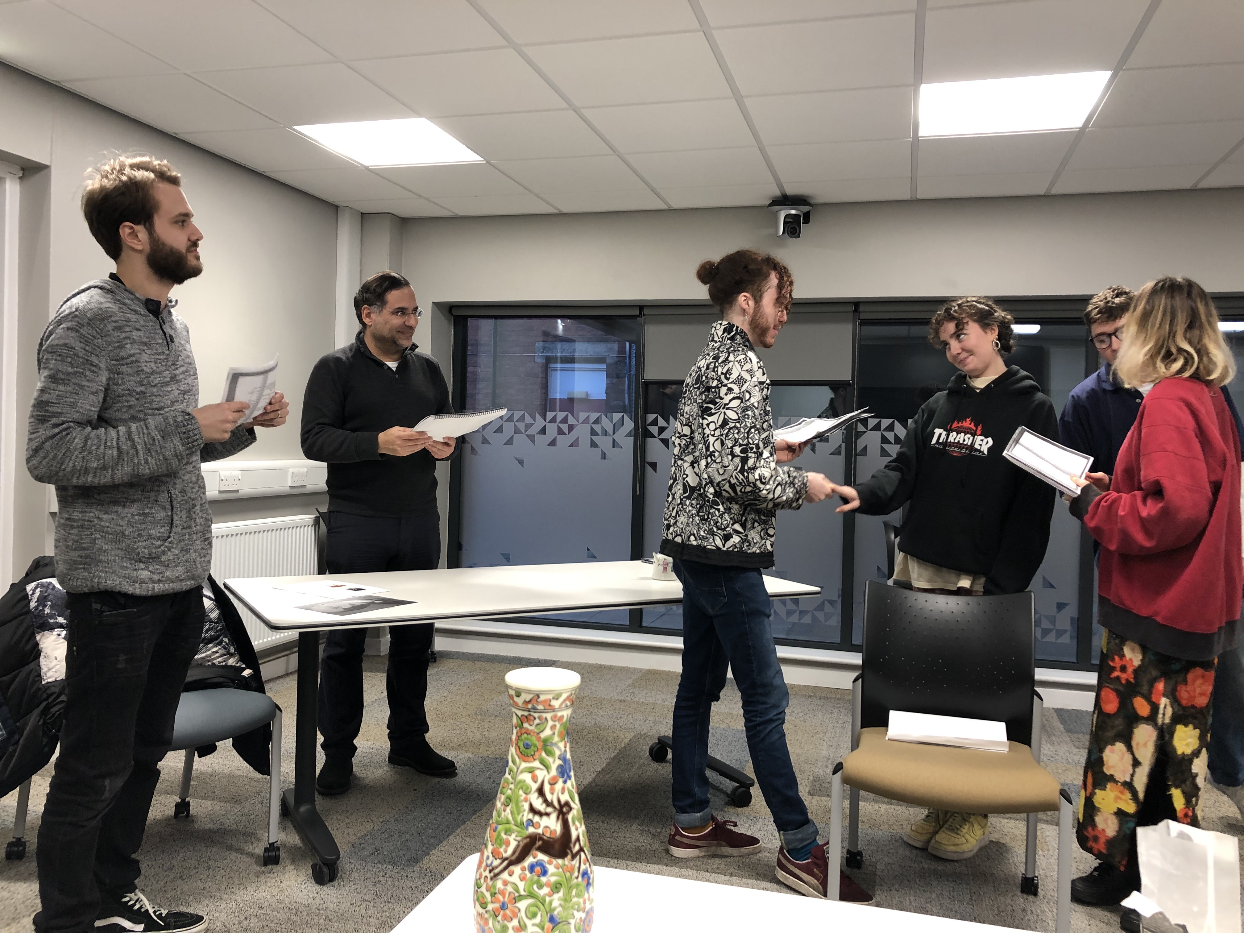 Our progress on re-staging our performance of Quinneys is coming along well; yesterday (a Saturday no less!) India Walton and I went to the Leeds Playhouse Costume Hire stores to choose the costumes for all the characters in the play – India is playing the part of ‘Mable Dredge’, Quinney’s typist, who in the play is in the triangle of love between James (Quinney’s foreman – played by Fergus Johnston) and Posy (Quinney’s daugther – played by Annabel Marlow) – here, (below) is India (left), with Annabel (centre) and Fergus (right) in rehearsals earlier in the week.