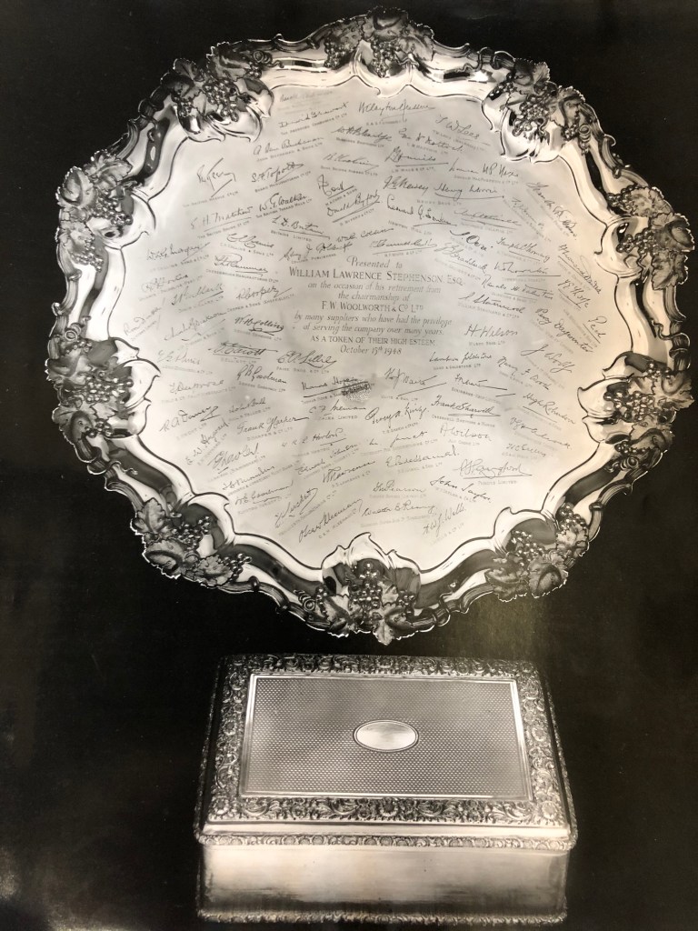 The wide range of commissions for silver that the firm undertook is illustrated by these two further examples – a large silver presentation salver, made as a gift to William Lawrence Stephenson Esq. on his retirement as chairman of F.W. Woolworth & Co. Ltd. in 1948.