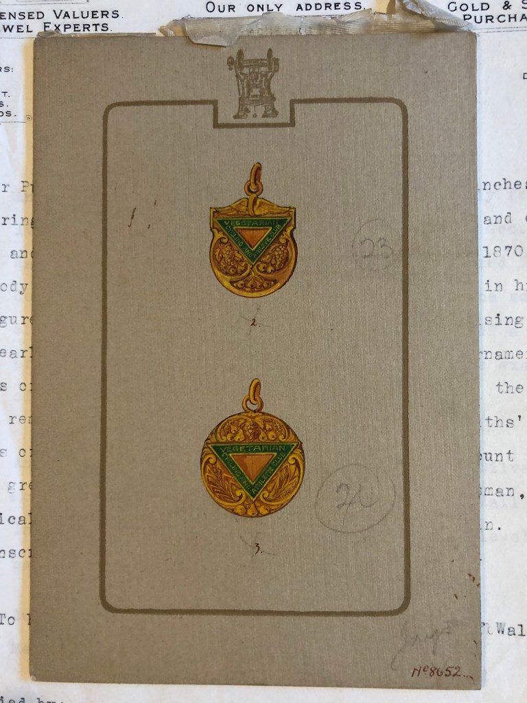 As well as the photographs of modern and antique silver, the album also contains a small number of fascinating watercolour designs for cups and medals, including these beautiful watercolours for designs for a medal for the Vegetarian Cycling and Athletic Club, dating from the 1930s.  The Club was established in 1888 and is still going.