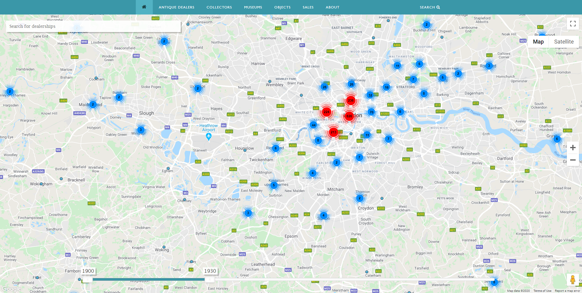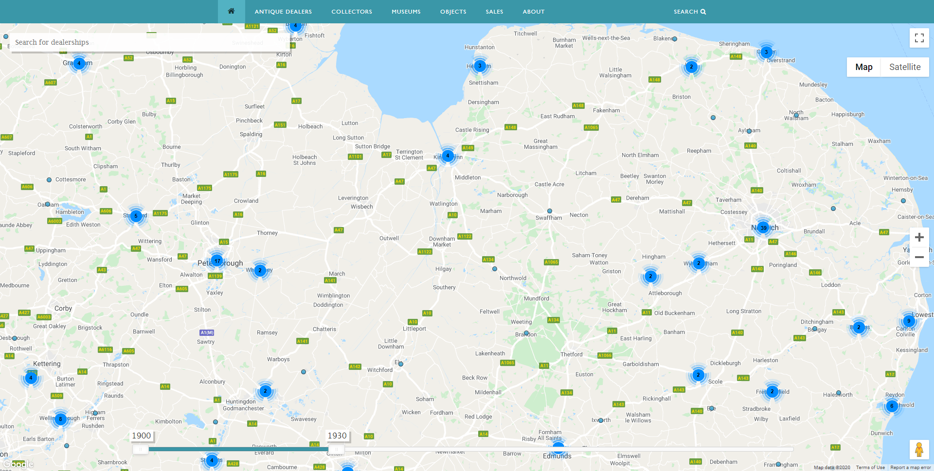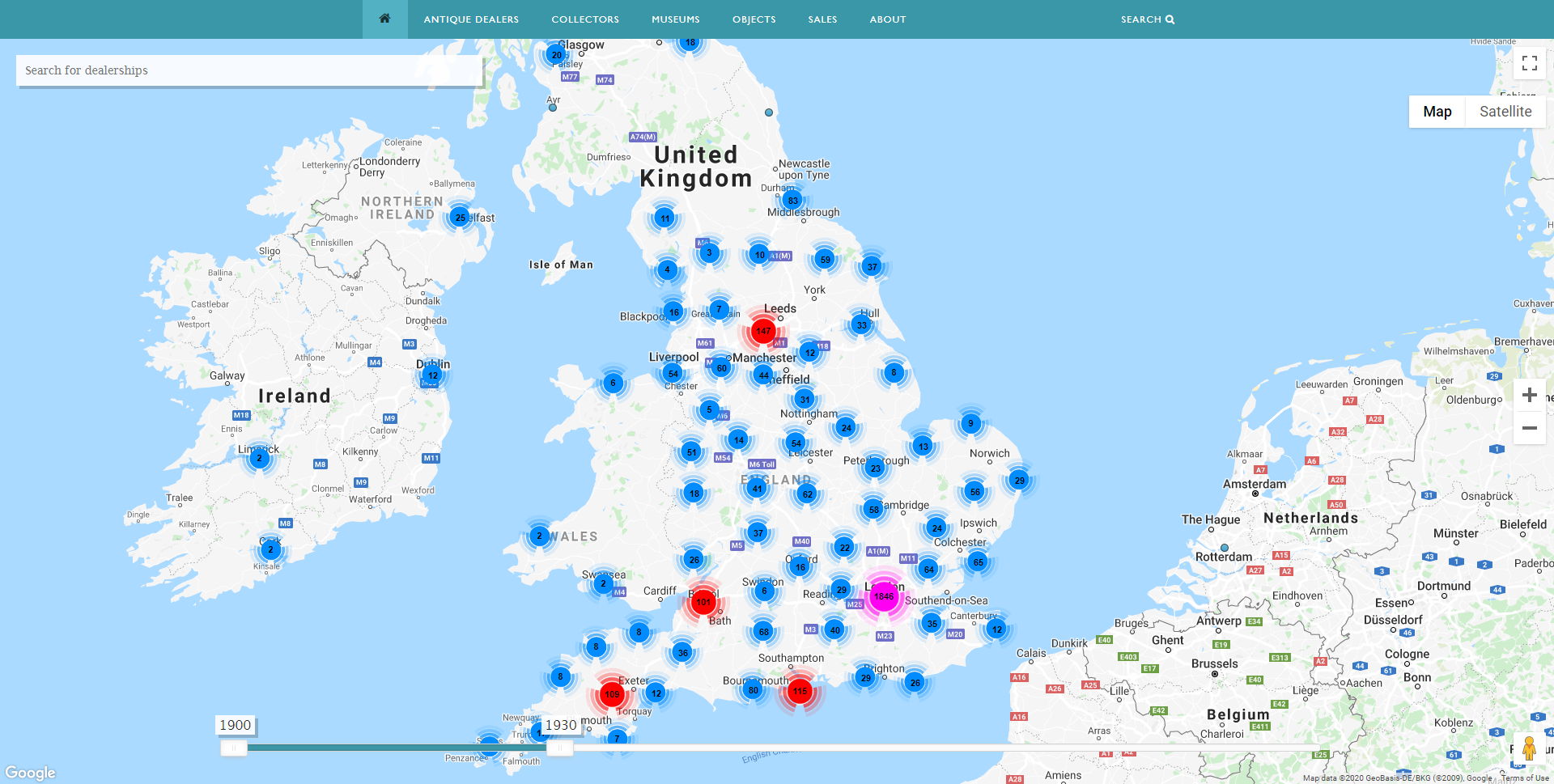 Antique Dealers Map showing dealers in Britain 1900-1930. Image, Antique Dealers Project, University of Leeds.