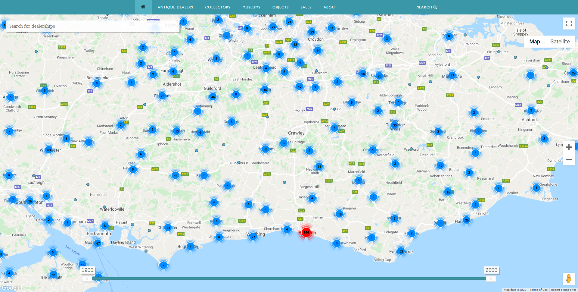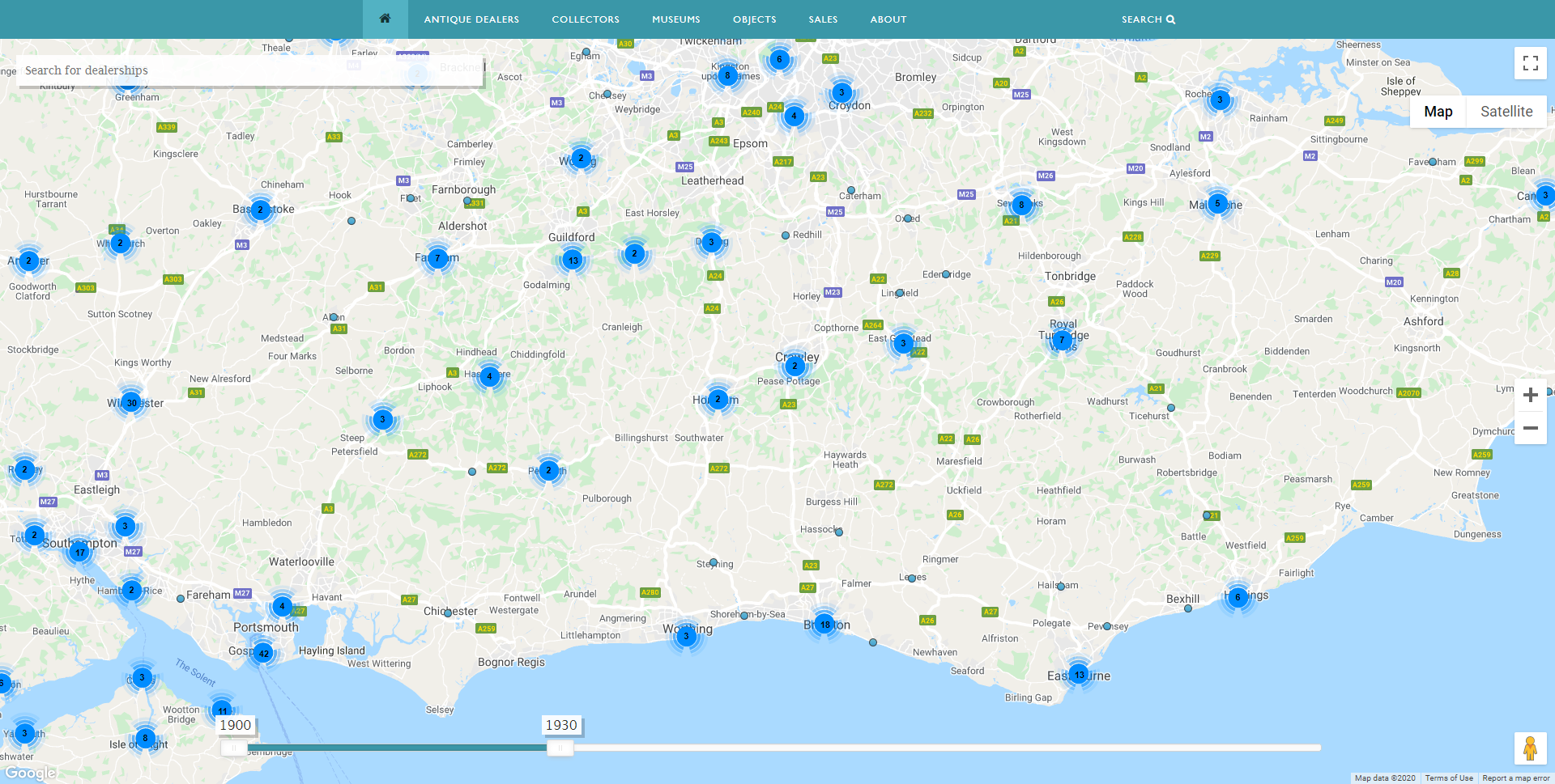Antique Dealers Map – showing dealer location on South Coast of England 1900-1930. Image, Antique Dealers research project, University of Leeds.