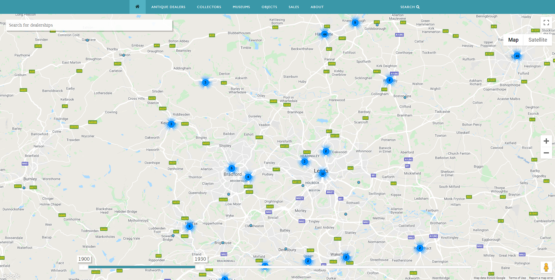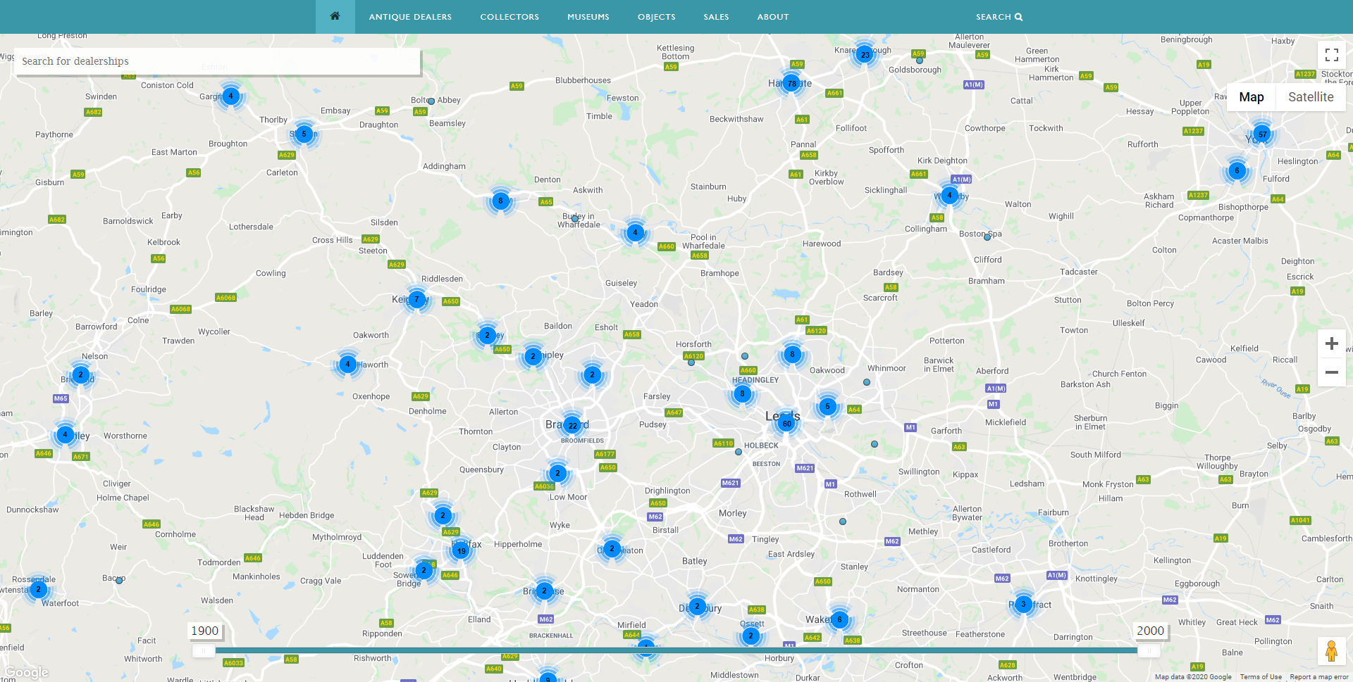 Antique Dealer Map – showing number of dealers in Yorkshire 1900-2000. Image, Antique Dealers research project, University of Leeds.