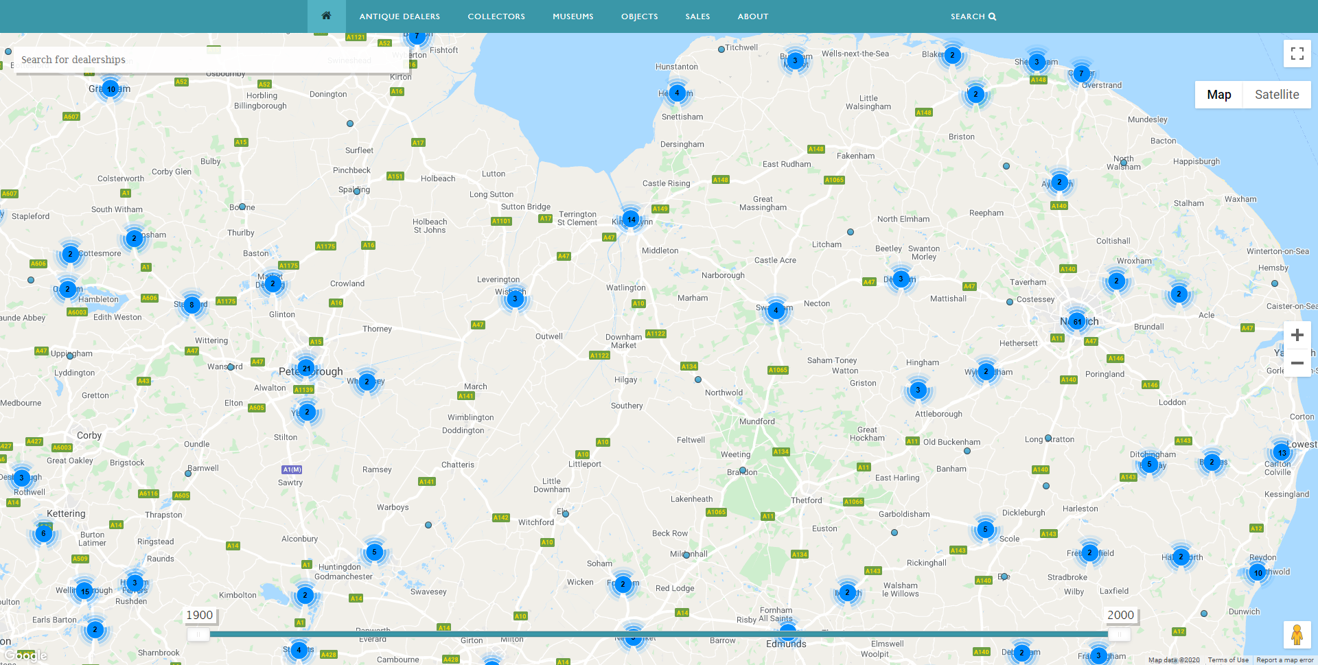 In this map (above), the number of dealers based in Norwich has risen to 61 (from 39) by c.1970. And the coastal towns of north Norfolk have also seen a significant increase in the numbers of dealers – Cromer now has 7 dealers, and there are a number of other towns and villages on the north Norfolk coast that now have antique shops. The Suffolk coastal towns of Lowestoft and Southwold have also seen the numbers of dealers increase (Lowestoft has risen to 13; Southwold to 10). Bury St. Edmunds also has an increase in the number of dealers, rising to 25 dealers in c.1970, from 10 dealers in 1930. Further inland, in Peterborough, there has been a less significant rise in the number of dealers, increasing to 21 dealers in c.1970, from 17 dealers in 1930. But again, what is striking is the general increase in the number of locations that have attracted antique shops by c.1970, with dozens of villages across Norfolk and Suffolk being chosen as key locations by antique dealers.