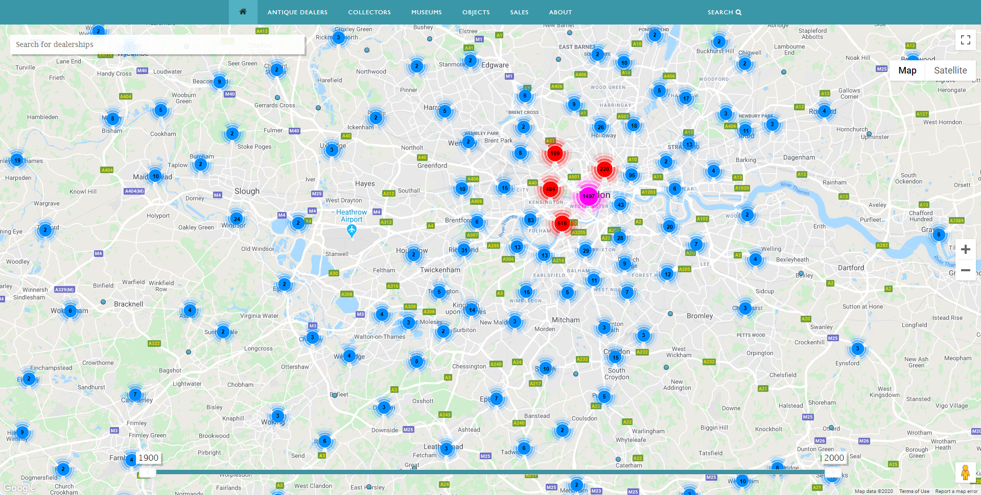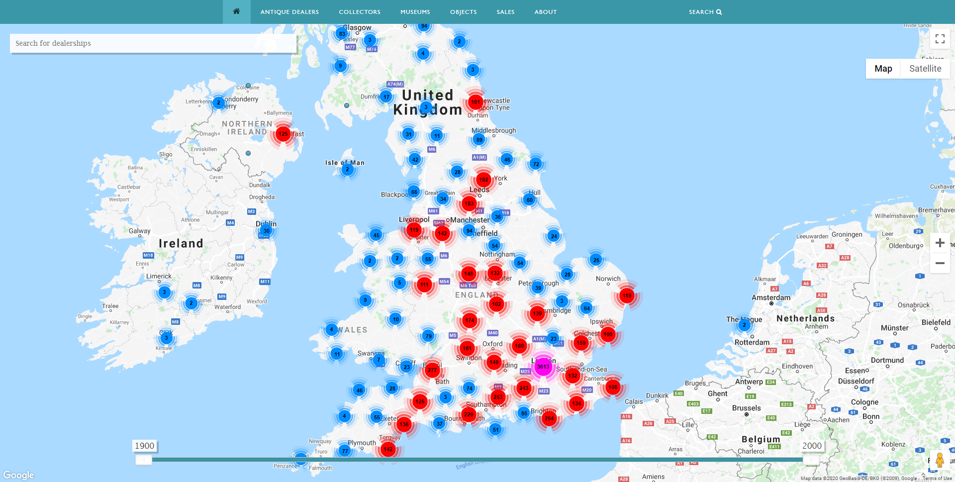 Antique Dealers Map showing dealers in Britain 1900-2000. Image, Antique Dealers project, University of Leeds.