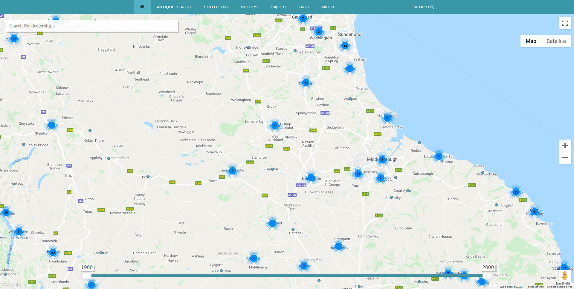 Antique Dealers Map – showing number of dealers in North East England 1900-2000. Image, Antique Dealers research project, University of Leeds.