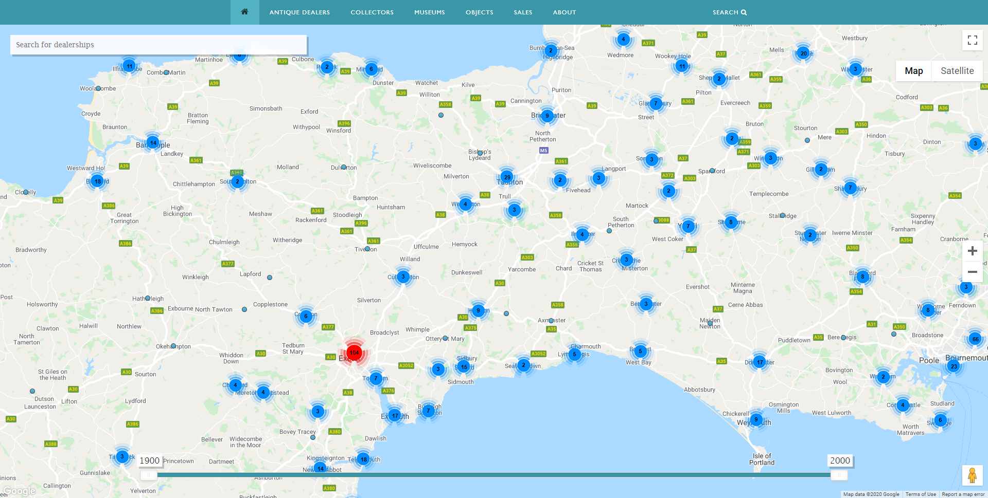 Antique Dealer Map, showing dealer locations in Devon and Somerset 1900-2000. Image, Antique Dealers research project, University of Leeds.
