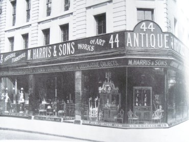 More recently, I’ve been doing some research on antique dealer firms and the film industry in the 20th century, and discovered some fascinating details of the role that some leading antique dealer firms played in the film industry during the period from the 1930s until the 1960s. For example, M.Harris & Sons, who were one of the most important dealers in antique furniture during the 20th century, advertised that their business included, ‘Hire and Hire-Purchase….for short or long periods, or household use. Also for Theatrical and Film Productions, at specially agreed rates’ (M. Harris & Sons, An Abridged Introductory Catalogue of Antique Furniture and Works of Art (n.d. c.1925), p.6. Here’s Moss Harris’ shop in New Oxford Street in London, in c.1921 –