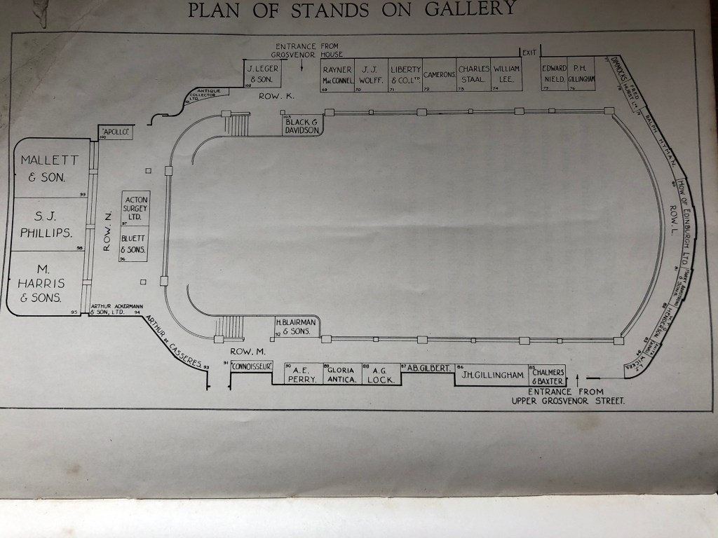 The floor-plan for the stands on the Gallery in the 1935 handbook illustrates the large stands taken by leading dealers such as Mallet & Sons, Moss Harris & Sons and the antique silver dealers S. J. Phillips (left side of the gallery).