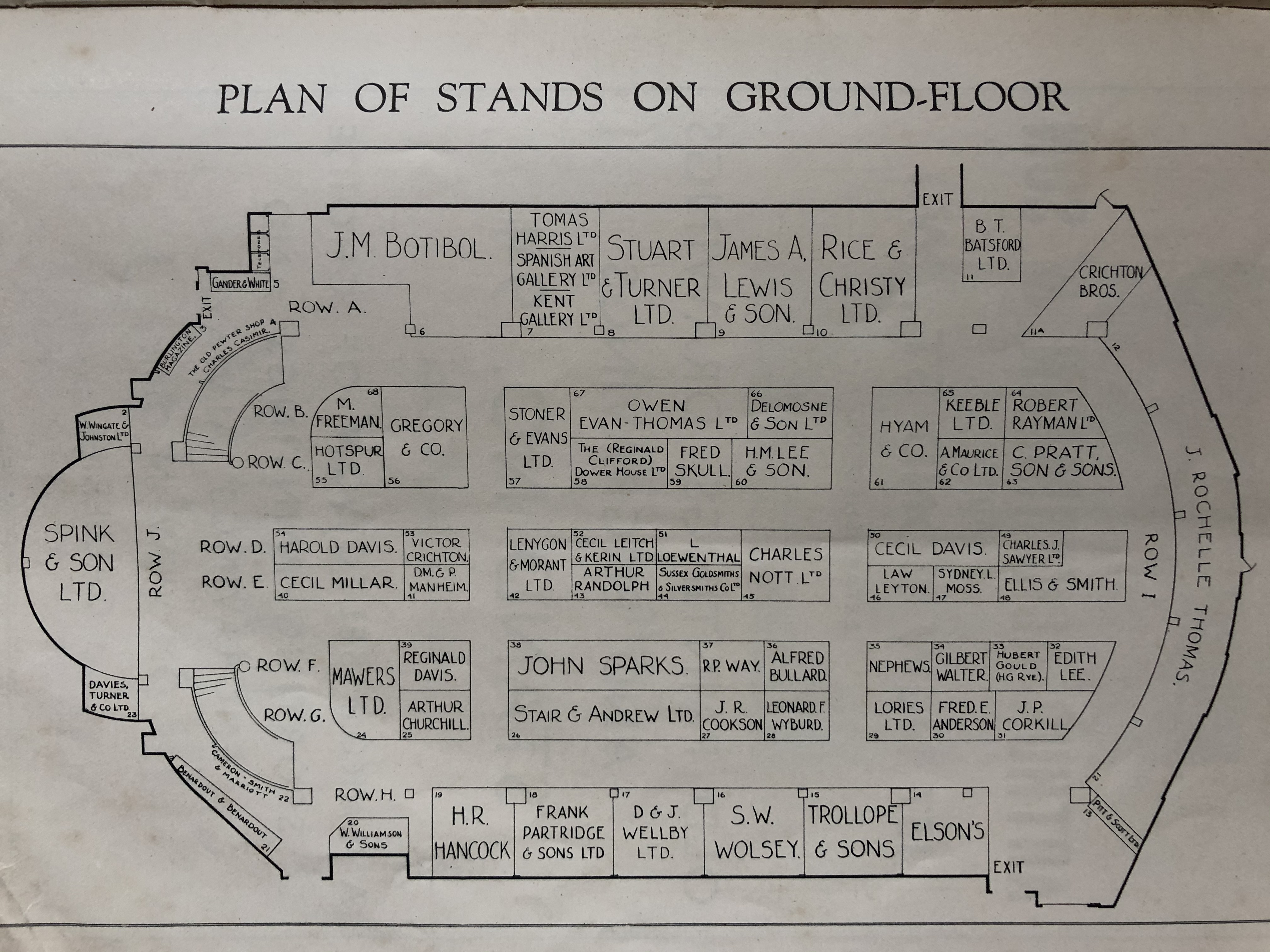 The floor-plan for the stands on the Gallery in the 1935 handbook illustrates the large stands taken by leading dealers such as Mallet & Sons, Moss Harris & Sons and the antique silver dealers S. J. Phillips (left side of the gallery).