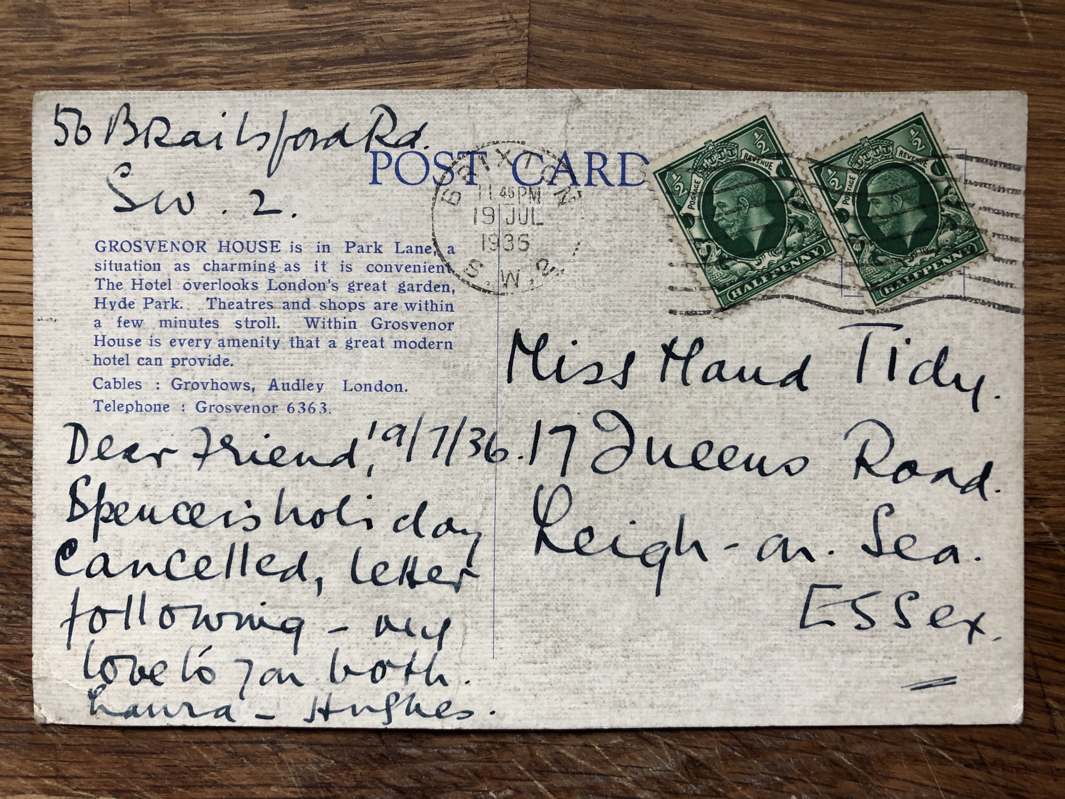 Verso of postcard with message to ‘Miss Maud Tidy’ 19th July 1935. Antique Dealers Research Project, University of Leeds.
