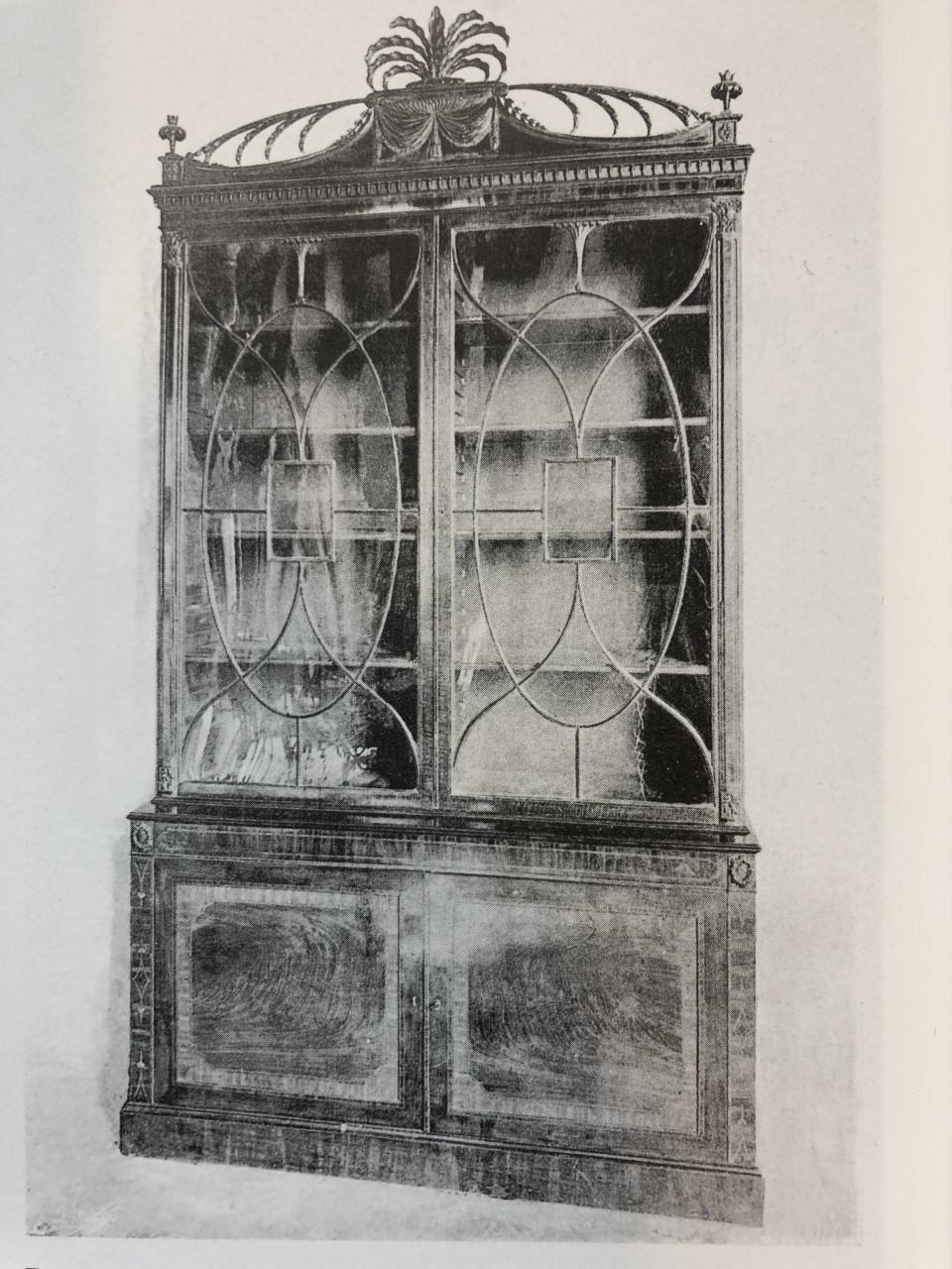 The bookcase, as the Kent Gallery invoice highlights, was formerly in the collections of the well-known American collector of antiques Francis P. Garvan (1875-1937), as well as that of the collector F.C. Hunter; but had also been previously illustrated in Percy MacQuoid’s A History of English Furniture (1904-1908) in the volume titled, The Age of Satinwood, ‘figure 185’. Illustrated below is the very bookcase.