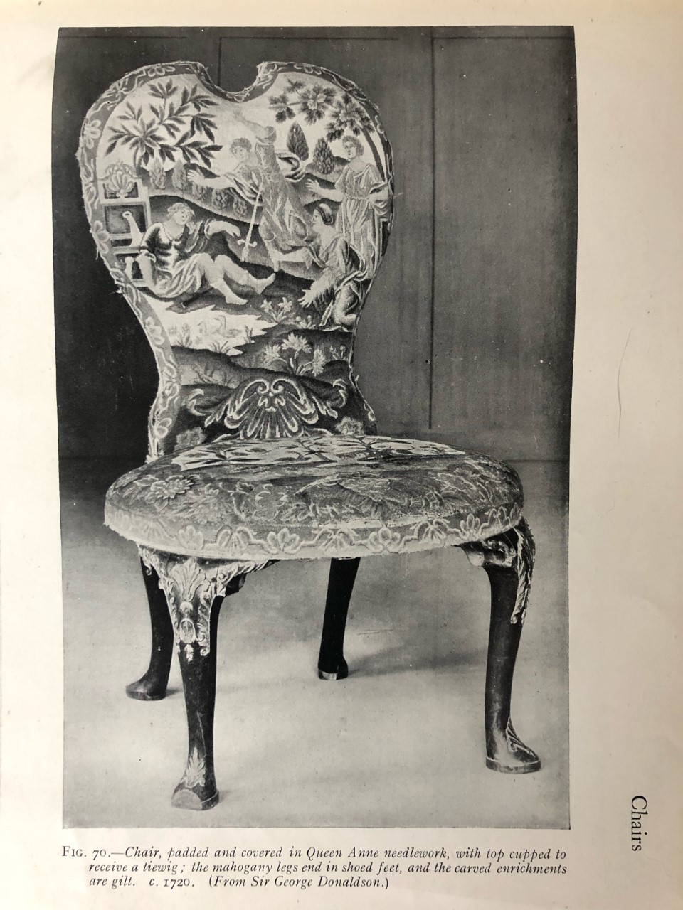 Thanks also to Chris Jussel and Chris Coles, who both pointed out to me that this chair is one of a set – there are two from the set in the Metropolitan Museum, New York, and another pair are also in the collections at the Lady Lever Art Gallery in Port Sunlight, near Liverpool. One of chairs was also illustrated in Macquoid and Edwards Dictionary of English Furniture (vol I. 1924), p.227, (which is also mentioned in the Kent Gallery advert) where it had a provenance to the collection of Sir George Donaldson (1845-1925). The Kent Gallery chair is evidently from the same set, with some minor differences (the Kent Gallery chair has brass studs to the seat covering for example).