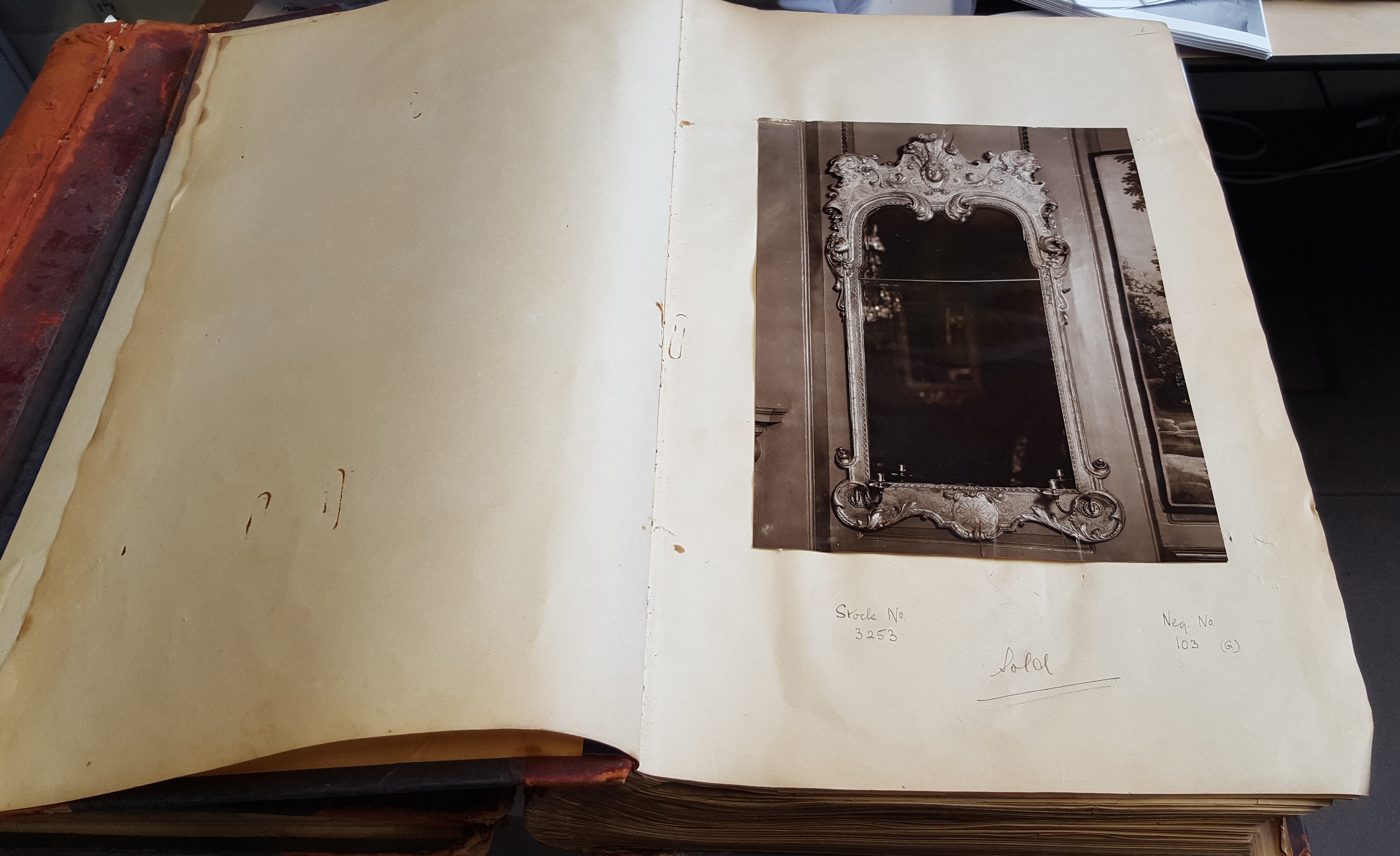 The 18th century chair in the photograph (above), from one of the albums, has an annotation indicating that it had been ‘Sold’ and includes a negative number for the photograph. The photograph below, shows an 18th century giltwood mirror (also indicated as ‘Sold’), and the negative number, but in this page the object is also inscribed with a stock number.