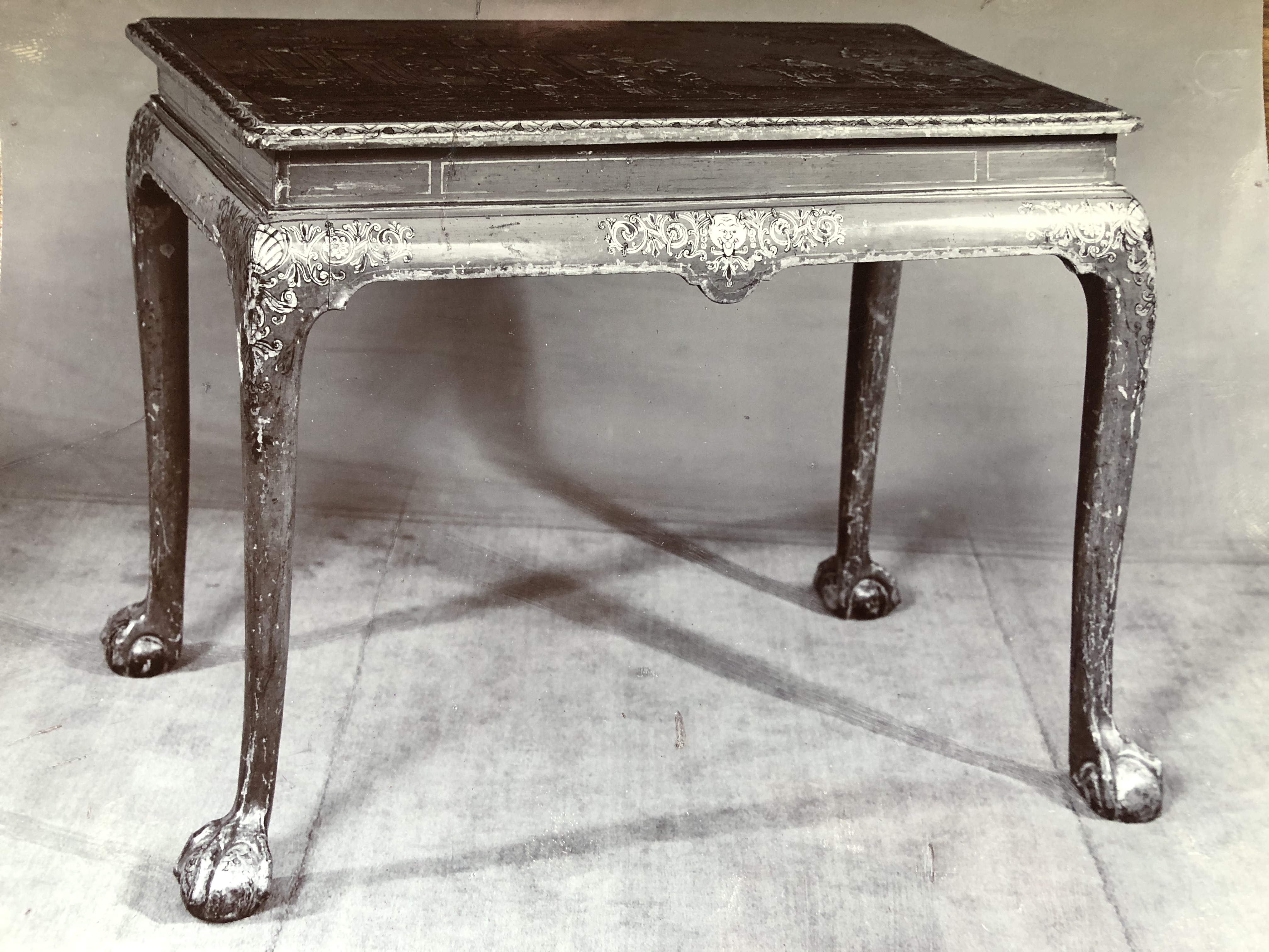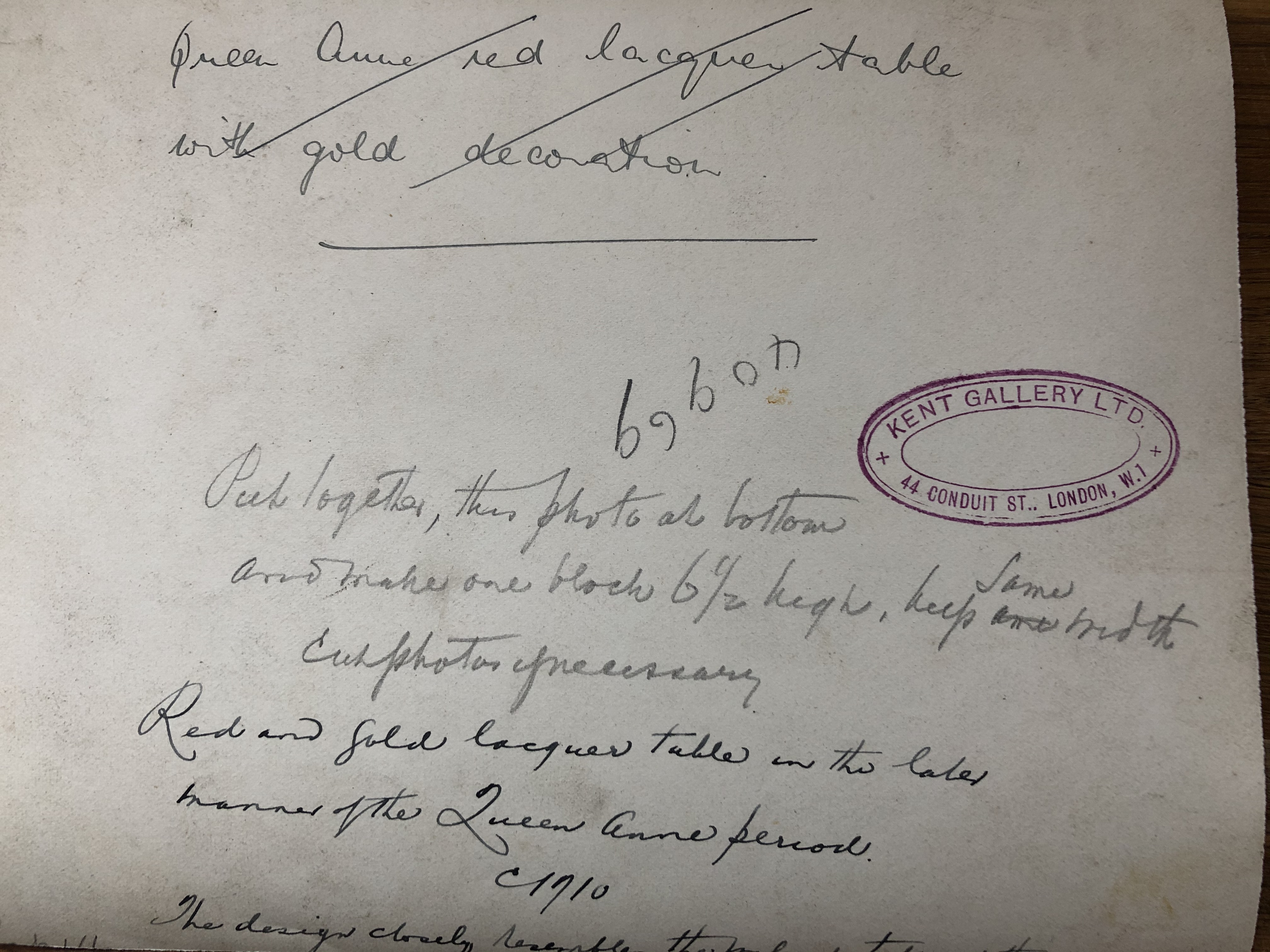 The verso of the photograph also shows the Kent Gallery stamp and with an inscription (in pencil) indicating that the photograph was being used in some publication (perhaps as part of an advertisement in Apollo or The Connoisseur magazines?). The inscription in ink describes the object – ‘Red and Gold lacquer table in the later manner of the Queen Anne period c1710’.
