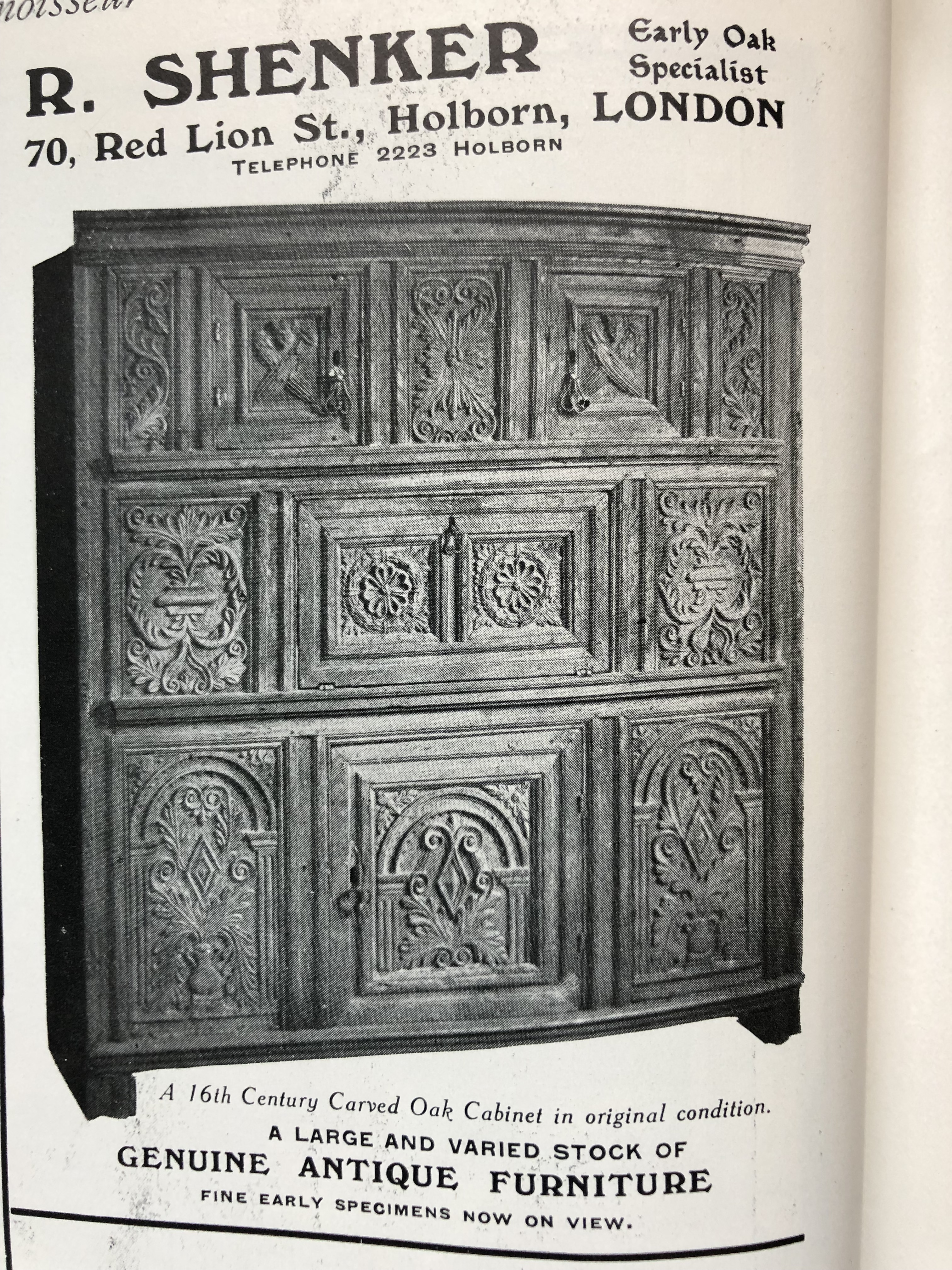 Rueben established his business in 1911, trading from Red Lion Street, London until 1936. He specialised in ‘early oak’, which was hugely popular for furnishers and collectors in the opening decades of the 20th century. In 1937 Reuben appears to have closed his Red Lion Street shop and became ‘manager’ of an antique dealing business, Coslyn Limited, who were based at St. Mary Abbott’s Terrace, London.
