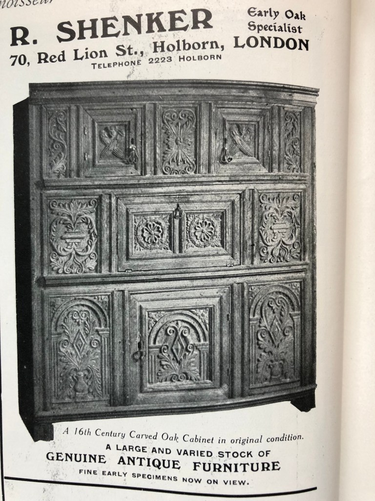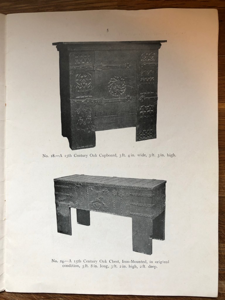 In his introductory remarks to the catalogue, Shenker draws attention to the popularity of ‘early oak furniture’. He writes, ‘In recent years Genuine Antique Furniture has come into greater favour with buyers of all tastes and classes than heretofore…..The most important and durable pieces are to be found in the early oak examples, which, while being quaint in design and workmanship, are the most useful for country residences.’