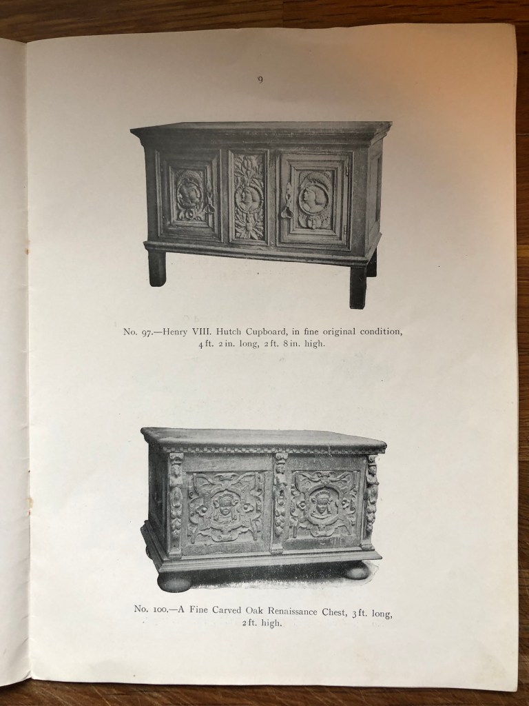 Reuben continued in his introductory remarks in his catalogue, highlighting the increasing importance of authentic specimens, which was a special concern for collectors of ‘old oak’ in the period, and of his own his expertise as a dealer. Reuben writes, ‘Having specialised in early oak furniture for many years, I offer intending purchasers the benefit of my experience to guard them against unfair dealing…I may mention that I have a large clientele all over the world, which has been obtained by giving satisfaction and by honest dealing.’
