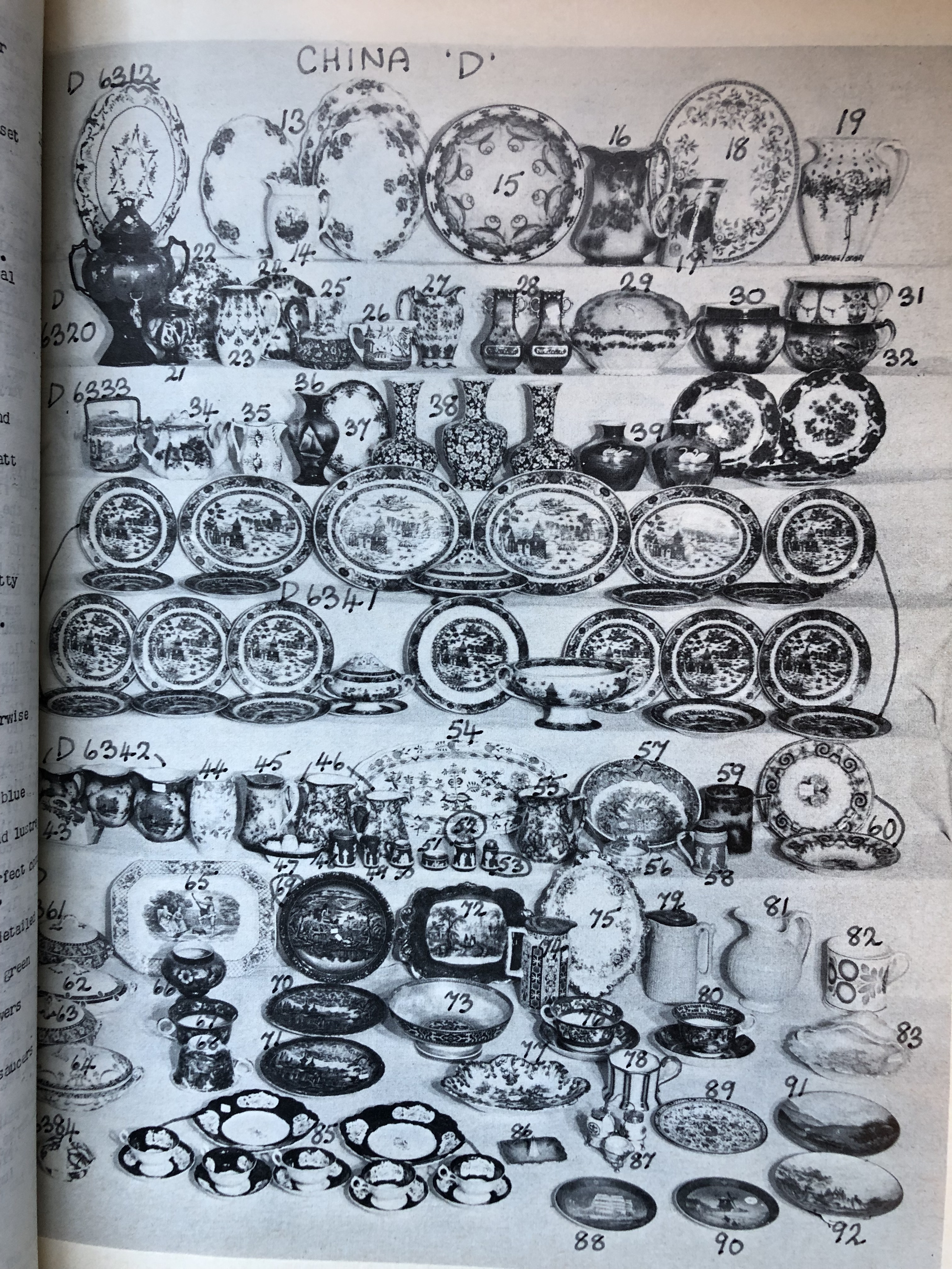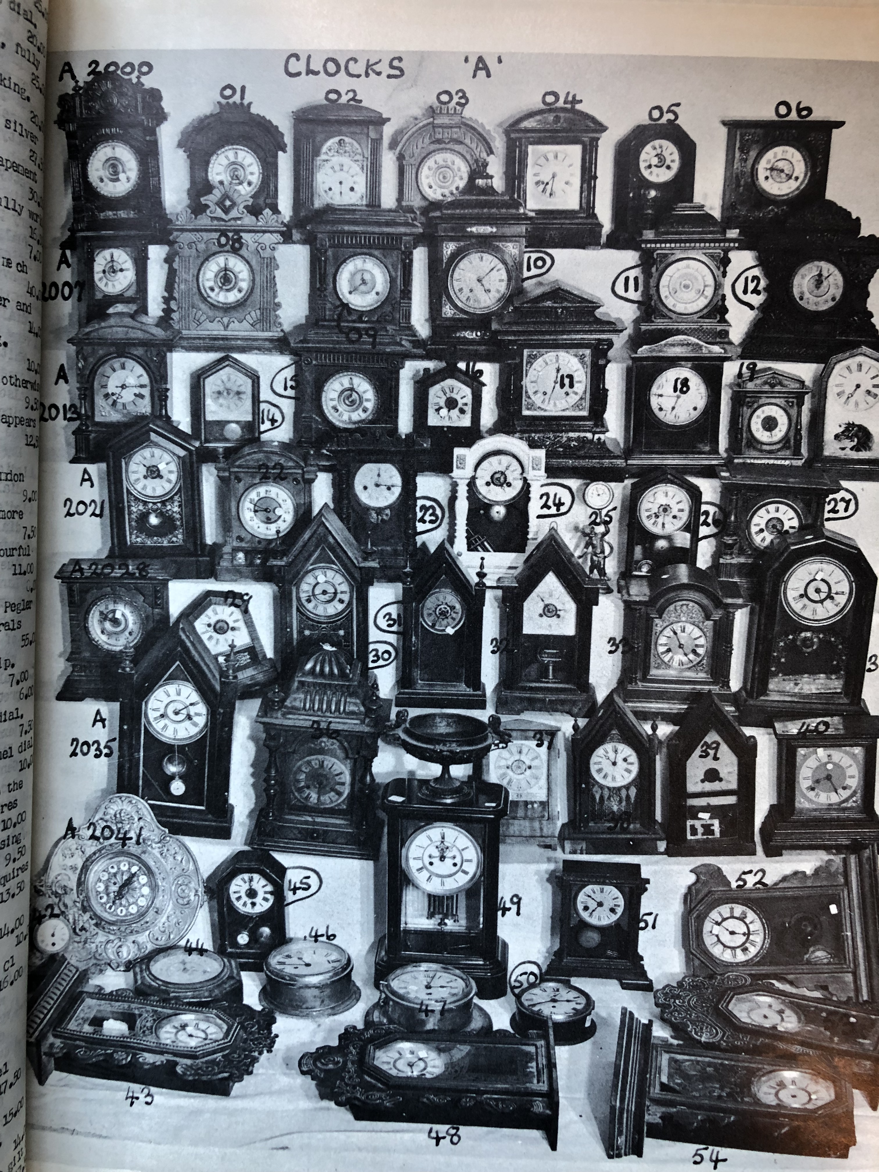 ‘China ‘D’ (above), illustrates one page of antiques for sale, with each item having a number, so that customers could order by telephone or post; for example ‘D6315′ (which is the bowl, top row, middle, with ’15’ written on it) – in the catalogue list this is described as ‘Flo blue bowl by ‘Malkin’, Burslem 16” di.[diameter] From a chamber set. Perfect.’ ‘$15.00’. Most of the antique ceramics appear to be of relatively low quality and value, all appropriate for ‘Shipping Goods’. There are dozens of pages devoted to the sale of antique clocks – here’s just one example (below), mostly priced at between $9.00 and $20.00. The most expensive antique clock on the page is no.17, (row three, middle) priced at $55.00 and described as ‘Fine quality 19th c. Bracket clock 18” high. Casing richly decorated with brass-work. Bevelled glass to bezel. Ornate silver and brass dial. Mach [machine] for time and strike in good order. Casing has side handles and is dark patina. Gen.[generally] Snd. [sound].