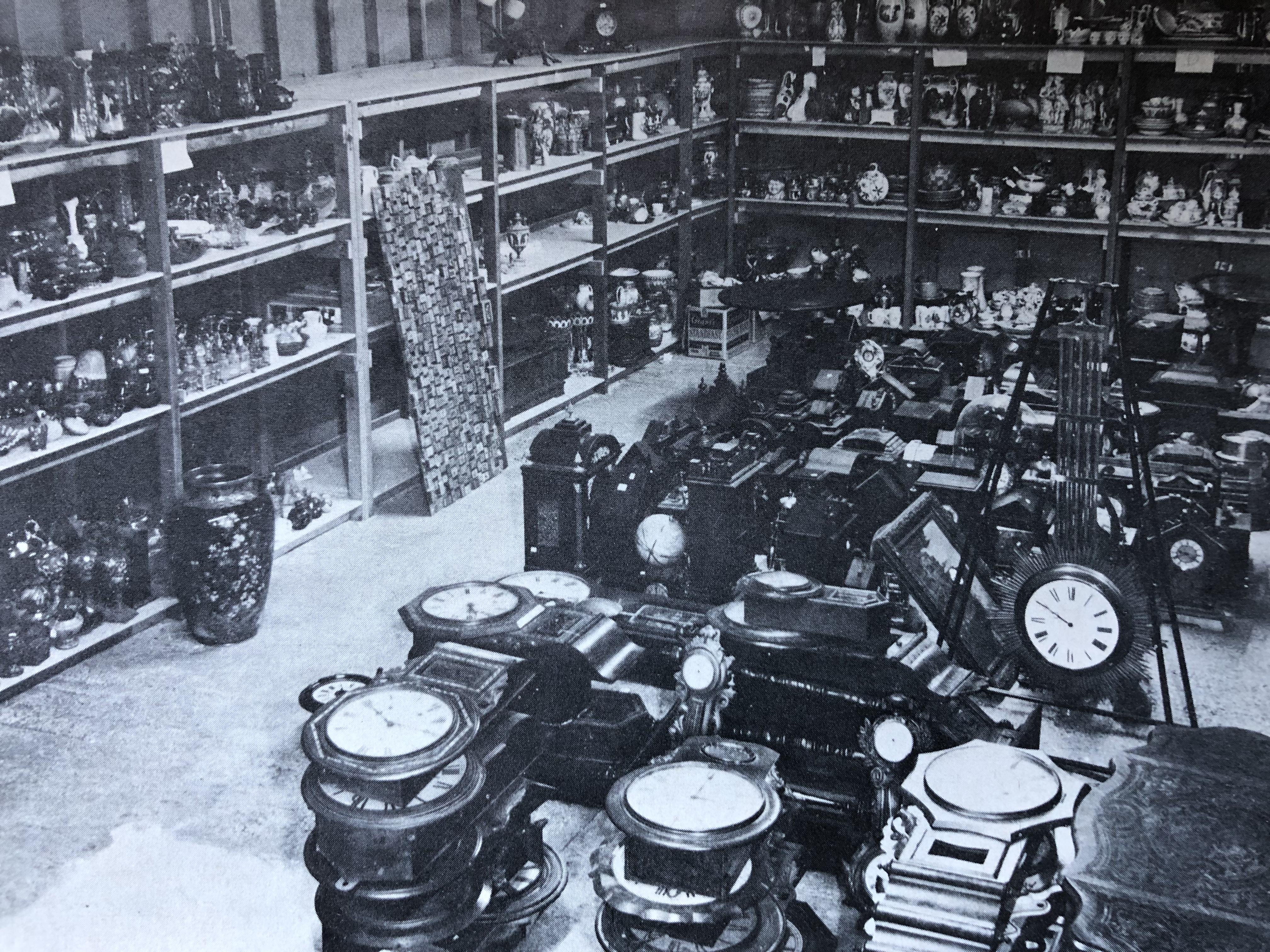 Images of the storerooms at the business reveal the enormous quantities of antiques that the business sold, with storerooms for antique glass, ceramics, metalwork, furniture, and extensive storerooms full of various types of antique clocks, from mantle clocks and wall clocks to longcase examples.