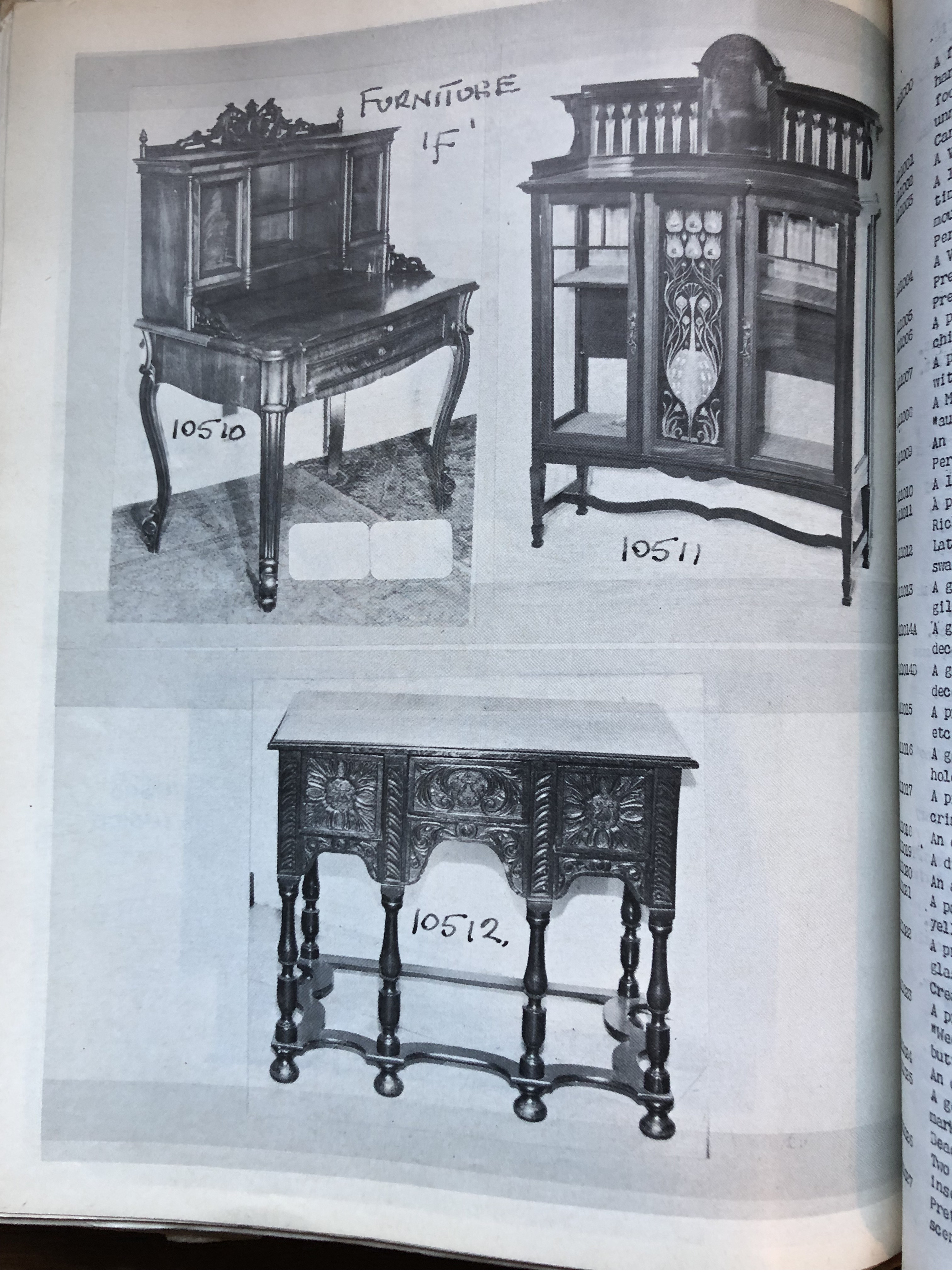 The antique furniture item ‘F 10510’ (top left) is described in the catalogue as ‘Cancelled’ – i.e. is must have been sold whilst the catalogue was in production; but looks like a mid-19th century Continental piece. Item ‘F 10511’ is described as ‘A pretty art nouveau style mahogany display cabinet. 45” wide 62” high. Note very pretty marketry [sic] panel to centre. of a stylised peacock. Rich colourful inlaid various woods with some oyster shell inserts. Ex. [excellent] patina. Very cln [clean] and snd [sound] cond.’ [condition]. It is priced at $85.00. The final item, ‘F 10512’ which looks like an early 18th century oak side table, but heavily re-carved in the 19th century, is described as ‘A pretty Victorian 17th century style carved oak loobey [sic]. 33” wide 29” high. 3 small drawers to the front. Richly carved front freeze [sic]. Exce. [excellent] patina. Very cln [clean] and snd [sound] cond.’ [condition]. It is priced at $175.00.