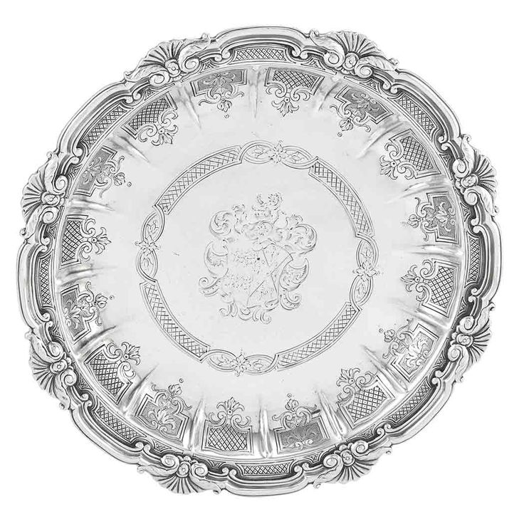 This dish, which appears to have been one of a pair, turned up at auction at Christie’s in London on 5th July 2005 (lot 19) in a sale of ‘Important Silver, the property of a European Collector’, when it sold for £7,200 (the Christie’s auction sale catalogue suggested that the engraved Arms in the centre were a later addition – (see below):
