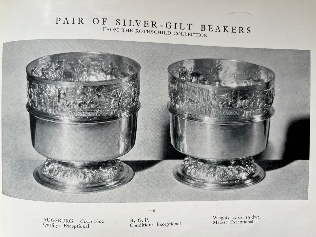 The How (of Edinburgh, Limited) catalogue also illustrates antique silver with very illustrious provenances. These examples, ‘The Lencker Tazza’ (silver-gilt, made by Elias Lencker in about 1570), and the silver-gilt beakers, made in Augsburg in about 1600, were both formerly owned by the Rothschild family – (see below):