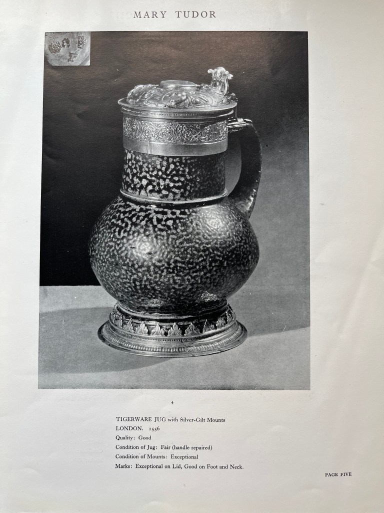 The catalogue offers a fascinating insight into a leading antique silver dealer’s stock in the 1930s, including, as one might expect given the status of How (of Edinburgh, Limited) as one of the leading antique silver dealers, some rare and important examples of antique silver. Here, for example, is a rare, early, ‘Tigerware’ jug with silver-gilt mounts, made in London in 1556 – (see below):