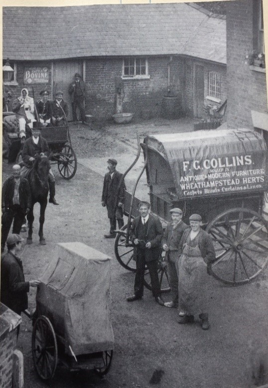 Charlie entered into partnership with his brother Fred in 1911, repairing and selling furniture from a small yard behind the Railway Hotel in Wheathampstead, before moving the business to 12 High Street, Wheathampstead (see photograph BELOW) . When money was tight, the brothers acted as cabbies, hiring horses from Tattershalls, the well-known auctioneers of horses. During the First World War their sisters looked after the business. After the War the brothers returned safely home to Wheathampstead from Europe and the Middle East, taking up the running of the business again.