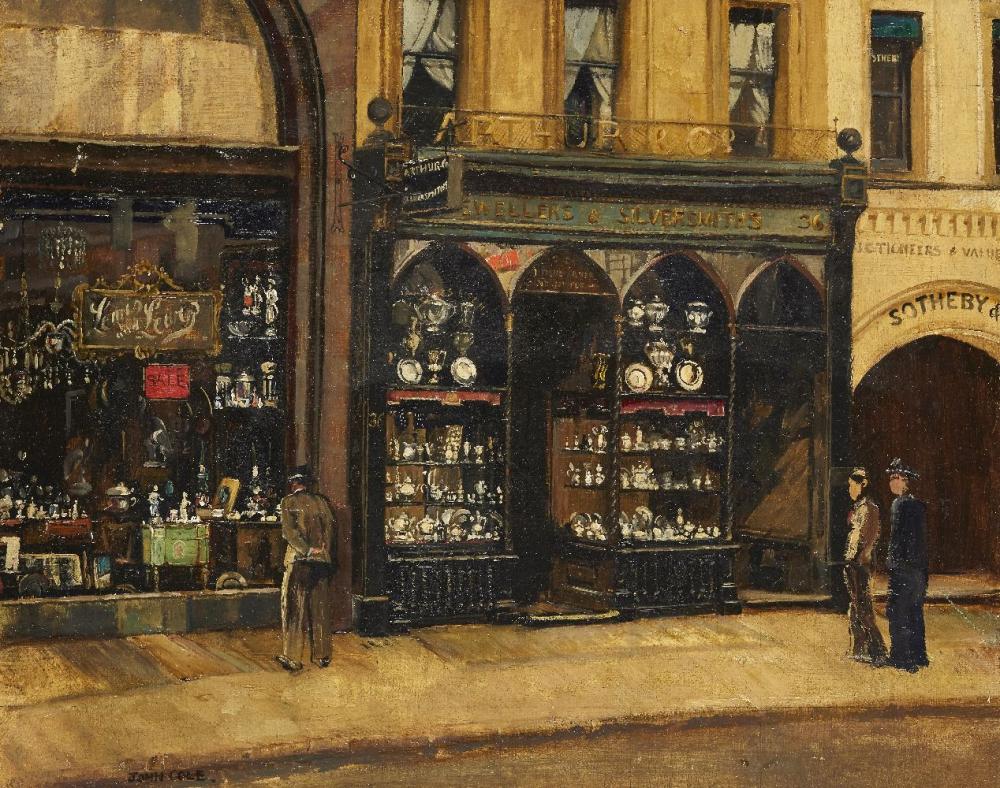 To the right is the shop of the antique silver dealers Arthur & Co., at 36 New Bond Street. Arthur & Co. were trading as antique dealers from at least 1900; by 1936 they had incorporated the business of the well-known antique silver dealer Reginald Davis. Arthur & Co. were right next door to Sotheby’s the auctioneers, when Cole captured their shop. To the left of Arthur & Co is the shop of Lewis & Lewis, one of the shops of the famous Lewis family of dealers, perhaps of James Lewis & Sons, the well-known antique dealer with shops in London and New York in the 1930s and 1950s. It’s interesting that Lewis & Lewis have a ‘sale’ ongoing in their shop in Cole’s painting – their shop window is full of a fascinating range of antiques.