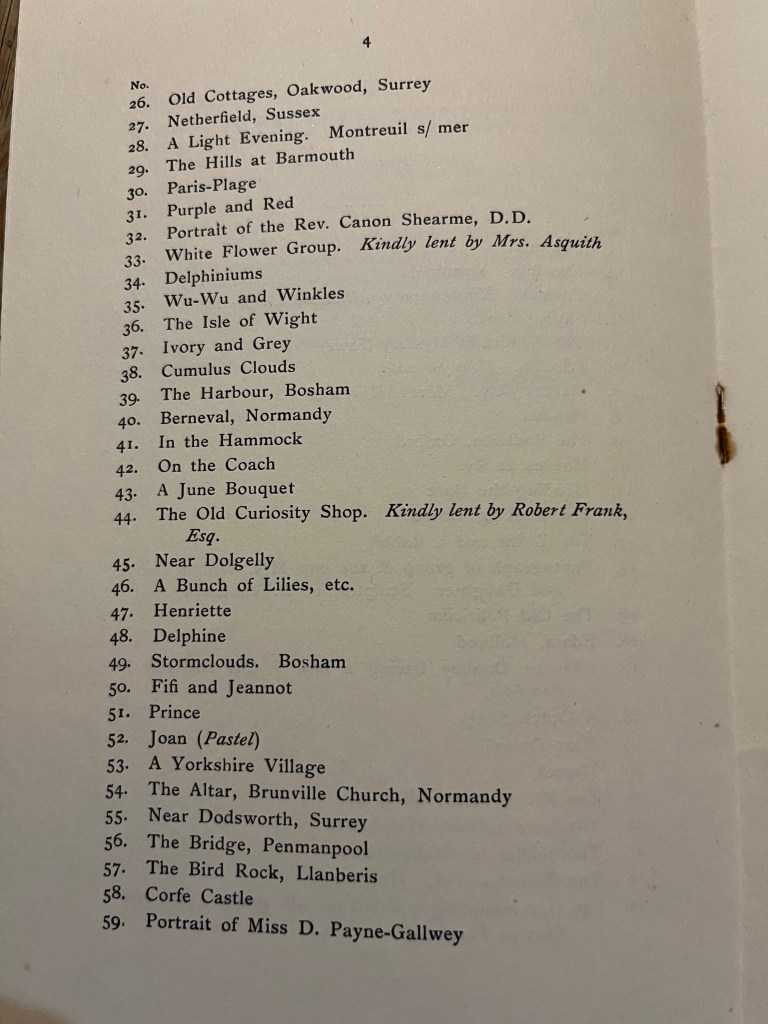 Donne was described in the exhibition catalogue as ‘an artist with remarkable talent’. The commentary continues: ‘Watercolour was Winifred Donne’s favourite medium, though she was equally familiar with pastels and pen-and-ink…she exhibited with conspicuous success at the International Society and in the watercolour room at the Royal Academy.’ The exhibition included Donne’s painting of the ‘Old Curiosity Shop’ then in the possession of ‘Mr Robert Frank’ (see below, ‘No.44’), perhaps the art dealer Robert Frank?