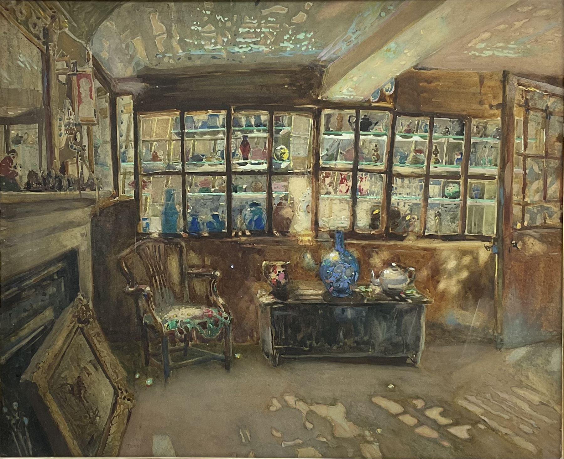 One final image of an antique shop (for this Blog post anyway) is, by contrast, a painting of an antique shop interior. This one, a beautifully atmospheric watercolour and gouache by the talented female artist Winifred Donne (1880-1922), titled ‘The Old Curiosity Shop’ was painted in about 1910.