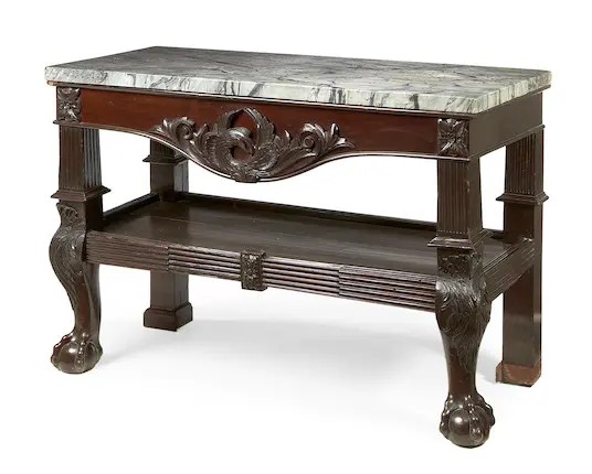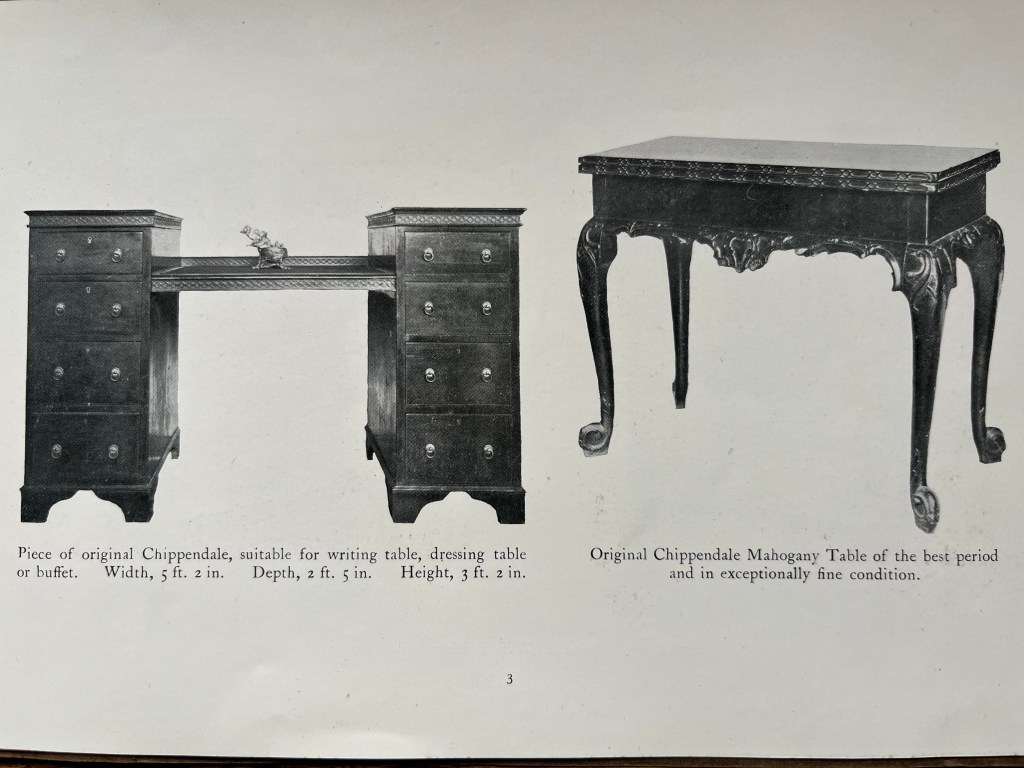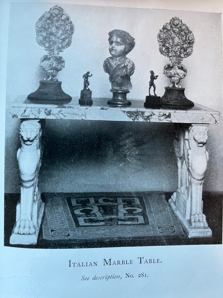 Many of the antiques illustrated in the catalogue are rather too generic to be able to trace and locate, but I have been able to find one object illustrated in the catalogue – described (erroneously) as a ‘Chippendale Mahogany Side Table. With heavy marble top. Magnificently carved panelled back, supported by four massive carved legs with claw and ball feet’ – priced at £27.10s.0d’.