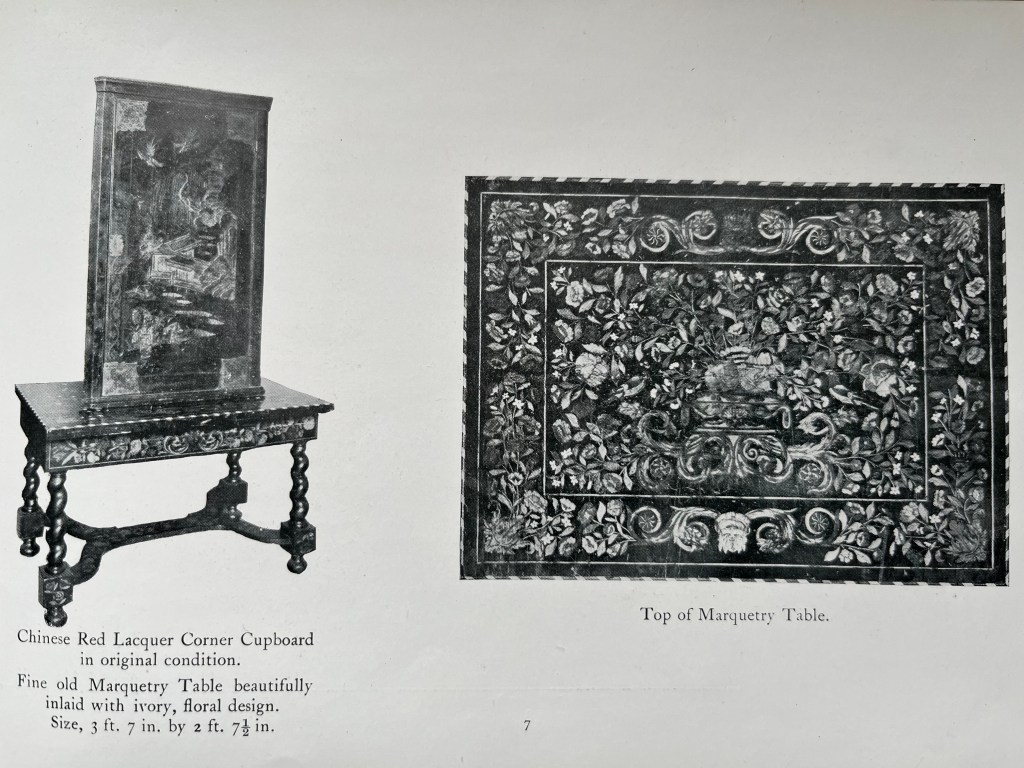 An ‘Old English Mahogany Tambour Shutter Front Cabinet’ (priced at £12.15s.0d) is listed as from the ‘Earl of Essex Collection, Cassiobury Park’ – the house was sold by the 8th Earl of Essex in 1922 and demolished for its materials in 1927. Incidentally, the famous staircase c.1677-80 from Cassiobury Park (attributed to the carver Edward Pearce) was sold by the antique dealers Edwards & Sons of Regent Street, London to the Metropolitan Museum in New York in 1932 (see here). Also in the photograph (below) is a ‘Charles II Oak Chair’, ‘in excellent preservation’, priced at ‘£17.10s.0d.’