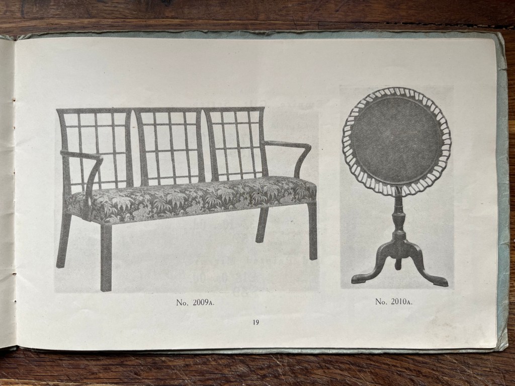 What appears to be different about The Furniture and Fine Art Depositories Ltd., is their mode of business, which, as they state in the catalogue ‘…is not like that of the ordinary dealer in antiques or the general trader.’ As they elaborate, ‘The greater portion of the goods for disposal by the firm are entrusted to it by private owners, who pay a small commission of ten per cent. on sums for which the articles are sold.’ In the catalogue are dozens of photographs of antique furniture alongside a few pieces of modern reproduction ‘Queen Anne’ furniture, so fashionable at the time. For example, a ‘Chippendale Mahogany Settee’, priced at ‘27.10s.0d’; this was from the ‘the Furness Collection’; and an ‘Old Mahogany Circular Pedestal Table’, priced at ‘£15.0s.0d’ (see below):