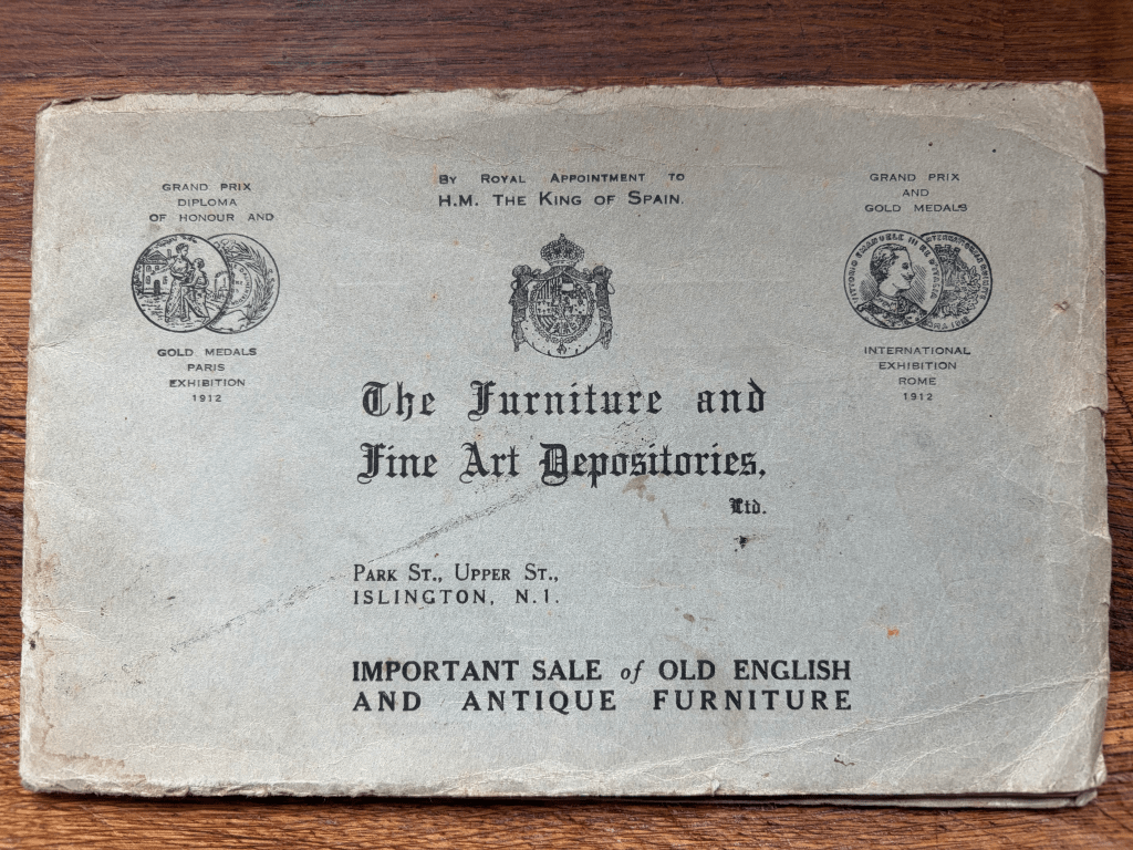 Our collections of antique dealer ephemera continues to grow, with the latest addition a sales brochure/catalogue produced by a dealer previously unknown to us (that in itself is most unusual!). The catalogue is undated (as are many of these dealer catalogues) but seems to have been published sometime in the early 1920s. The previously unknown dealer is ‘The Furniture and Fine Art Depositories Ltd.’, who traded from what appears to be an department store (see previous blog posts on antiques in department stores 31st August 2025; 29th April 2021; 2nd November 2014). The shop was located in Park Street, Upper Street, Islington, London N1 (the location has a long association with antique dealing, especially in the Post Second World War period).