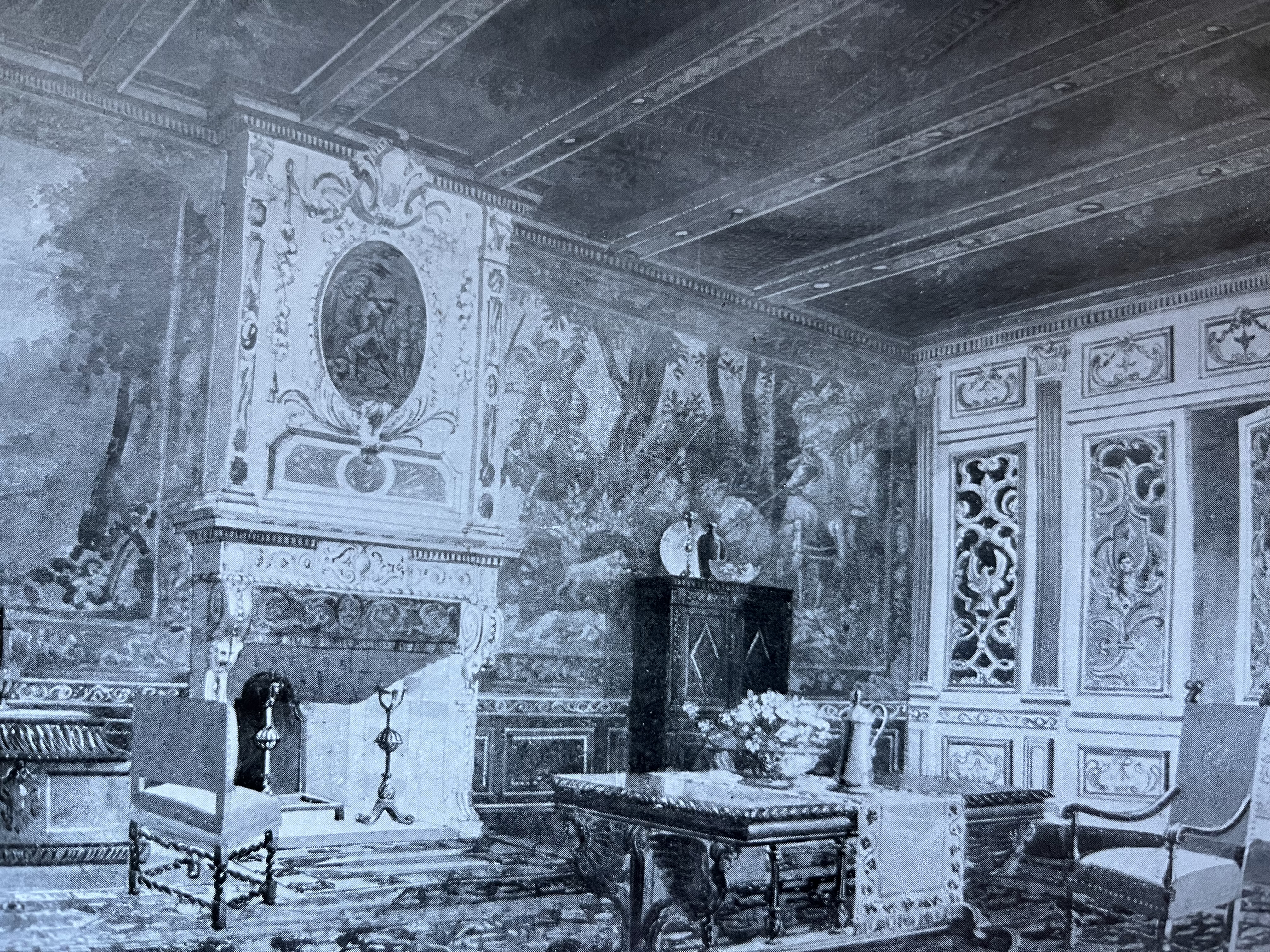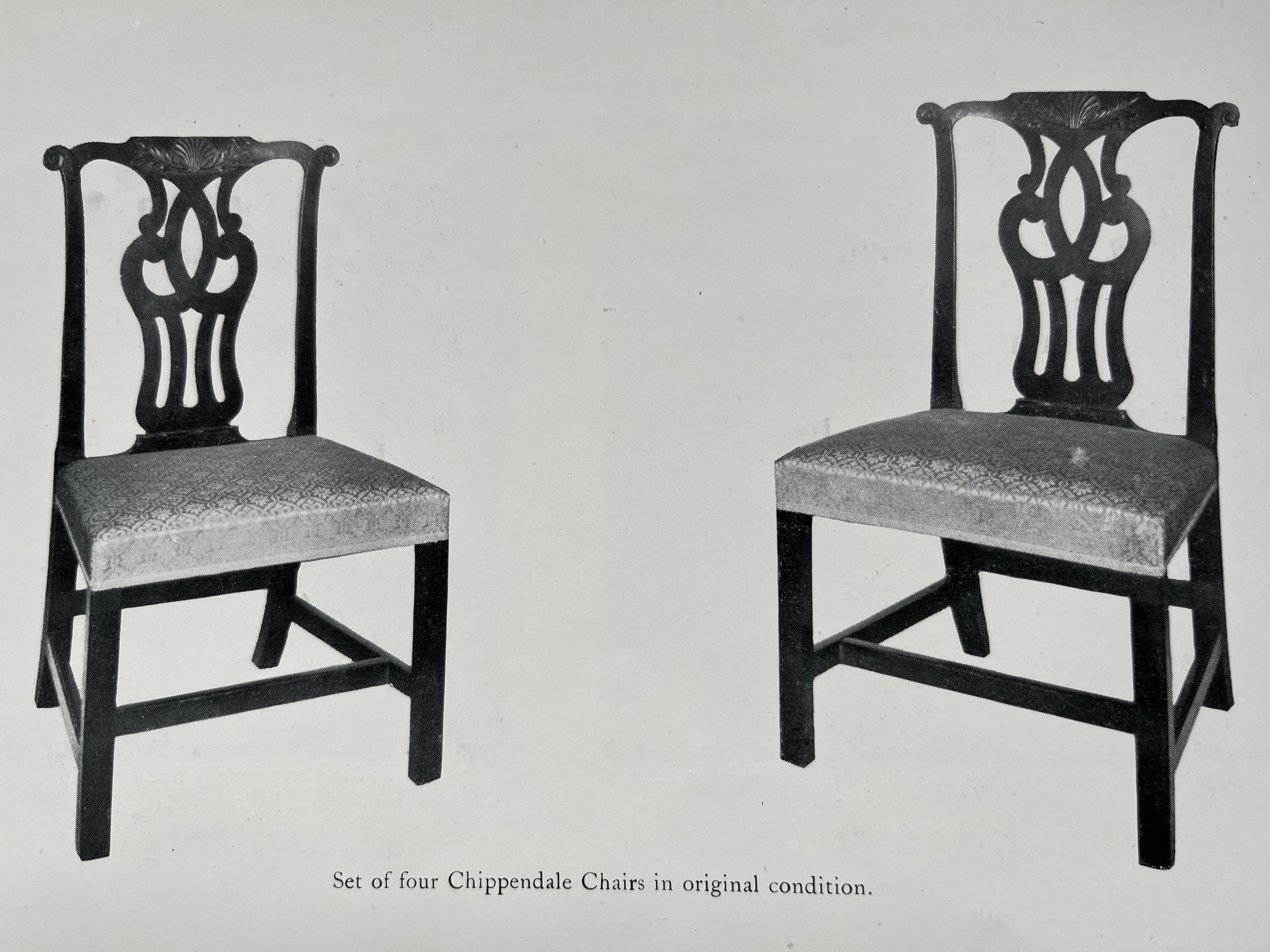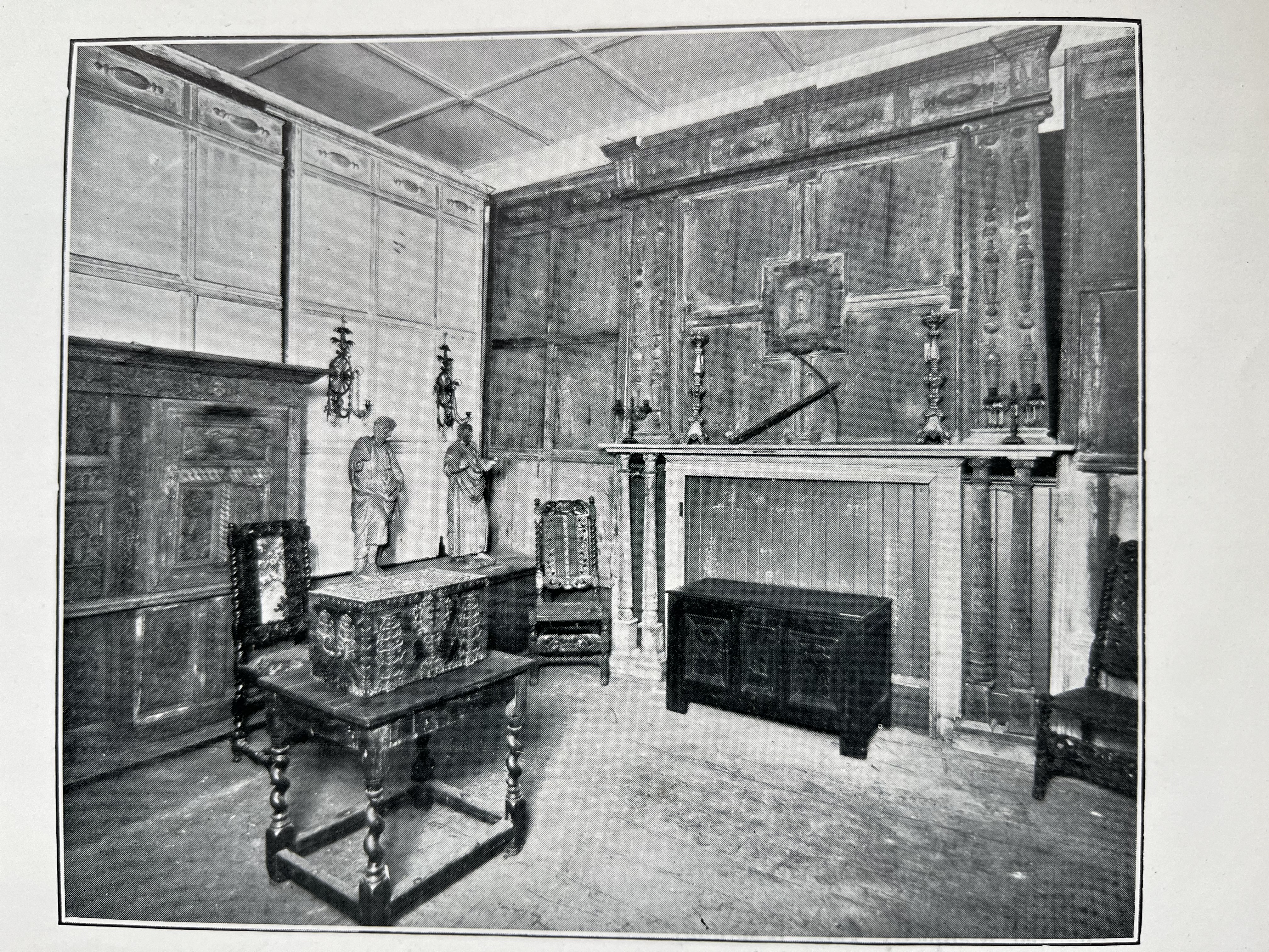 An ‘Old English Mahogany Tambour Shutter Front Cabinet’ (priced at £12.15s.0d) is listed as from the ‘Earl of Essex Collection, Cassiobury Park’ – the house was sold by the 8th Earl of Essex in 1922 and demolished for its materials in 1927. Incidentally, the famous staircase c.1677-80 from Cassiobury Park (attributed to the carver Edward Pearce) was sold by the antique dealers Edwards & Sons of Regent Street, London to the Metropolitan Museum in New York in 1932 (see here). Also in the photograph (below) is a ‘Charles II Oak Chair’, ‘in excellent preservation’, priced at ‘£17.10s.0d.’