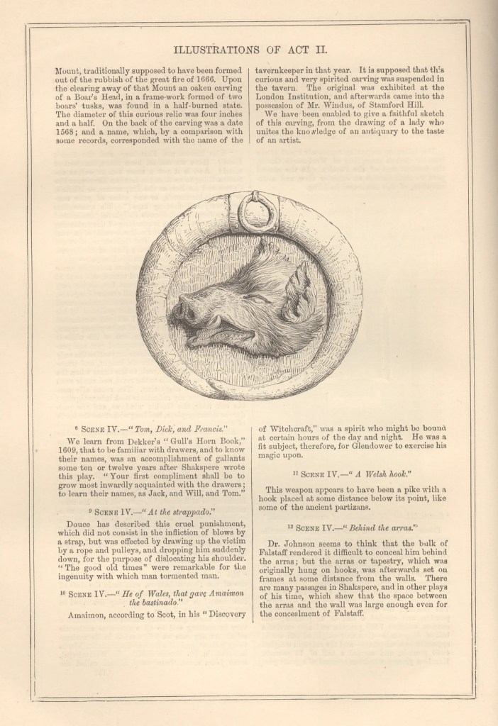 The ‘Boar’s Head’ was offered for sale at the auction of the collection of Thomas Windus in 1855 where it was reportedly sold for £25 and 4 shillings to the Shakespeare scholar James Halliwell-Phillipps (1820-1889), editor of a lavish Shakespeare Folio edition at the time. It was illustrated in The Pictorial Edition of the Works of Shakespeare edited by Charles Knight (volume 1, 1839-42) – (see below).