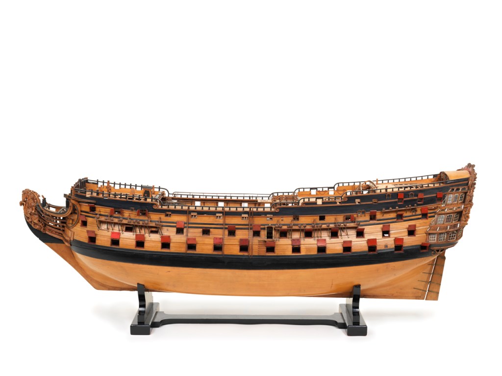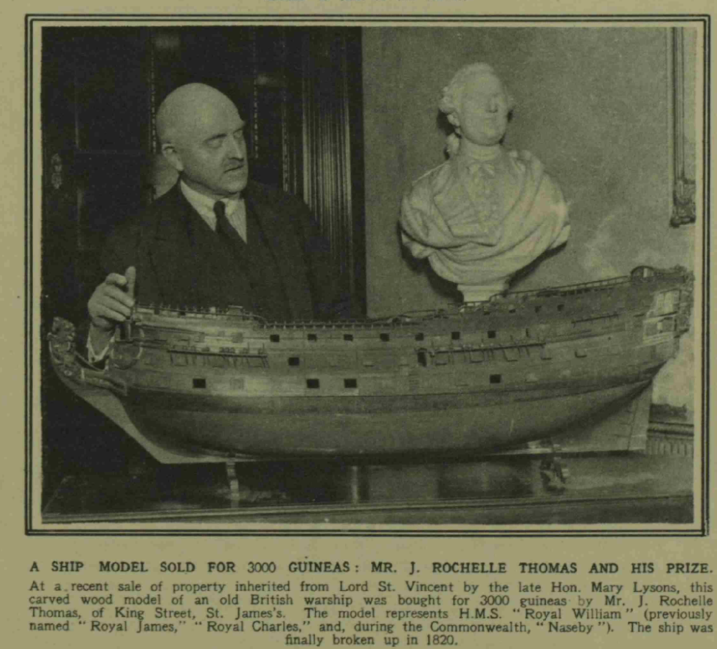 The photograph shows Joseph Rochelle Thomas (1865-1938) with a wooden model of the warship ‘Royal William’ (1719) scale 1.48, and made in 1719. As the report states, Rochelle Thomas bought the ship model (I guess in 1928) for 3,000 guineas (£3,150), an enormous sum (hence the newspaper report), which would have been as much as £1.3m at the time – in relative income value – see measuring worth.com The model is now in the National Maritime Museum at Greenwich (not on display); it seems to have been acquired by the museum through the antique dealer J.M. Botibol, who had a well known antique shop in Hanway Street in London in the period. Chris tells me that the ship was advertised as ‘seen by appointment at Mr. Botibol’s shop’. It may be that Rochelle Thomas and Botibol bought the ship model in partnership with one another (this was, and still is, a common practice in the antique trade).